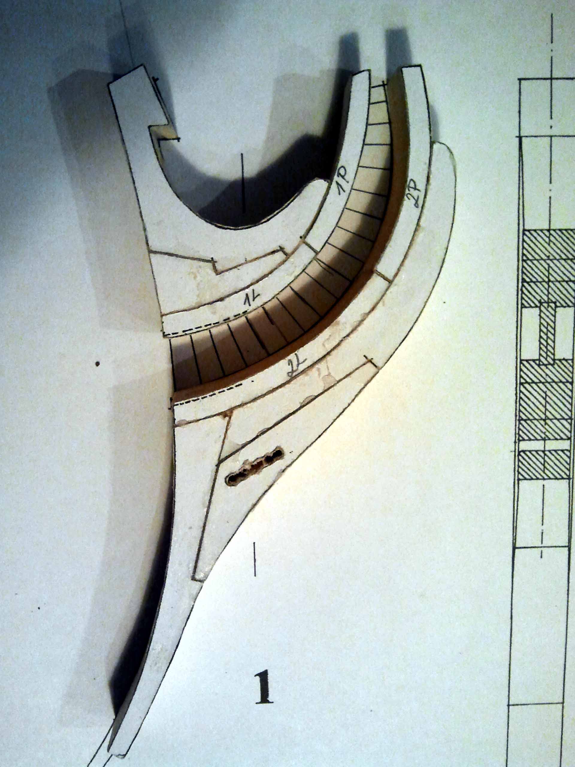 Oszlifowałem wstępnie pierwsze 17 wręg.Tarnik obrotowy okazał się niezastąpiony.Z wręg ułożonych jedna na drugiej zaczyna wyłaniać się kształt kadłuba.Doszlifowywał będę wałkiem ściernym przed montażem w stoczni.
