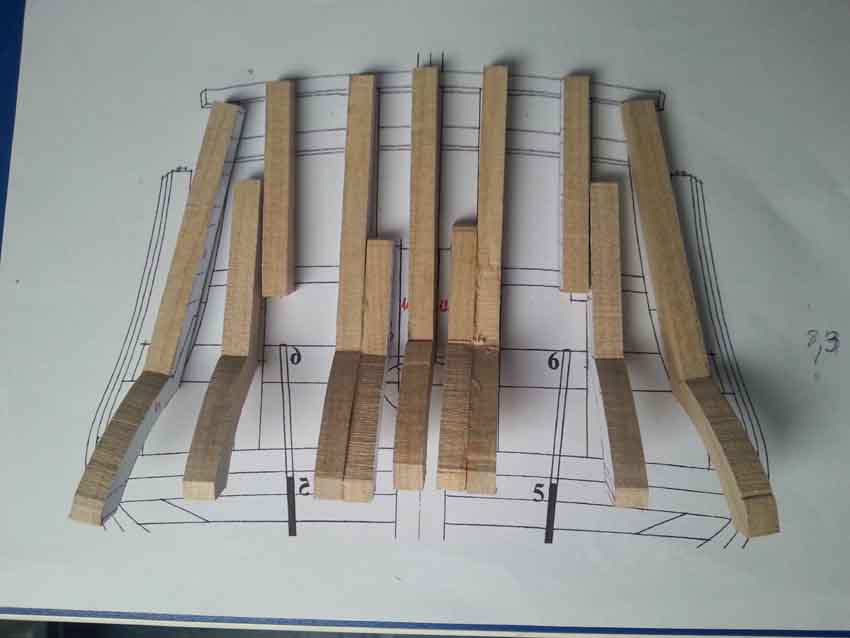 Tak jak napisałem kadłub wrócił do stoczni,Pozostanie tam dopóki nie przykleję części poszycia i listwy (belki) pod pokładniki. Kadłub cały czas pracuje pomimo pobytu w stoczni.Po zamocowaniu napiętego cienkiego drutu wzdłuż osi symetrii od czasu do czasu dokonuję pomiarów w wybranych punktach.Co do drewna to dalej pozostanę przy jaworze na elementy konstrukcyjne,poszycie zrobię z gruszy.