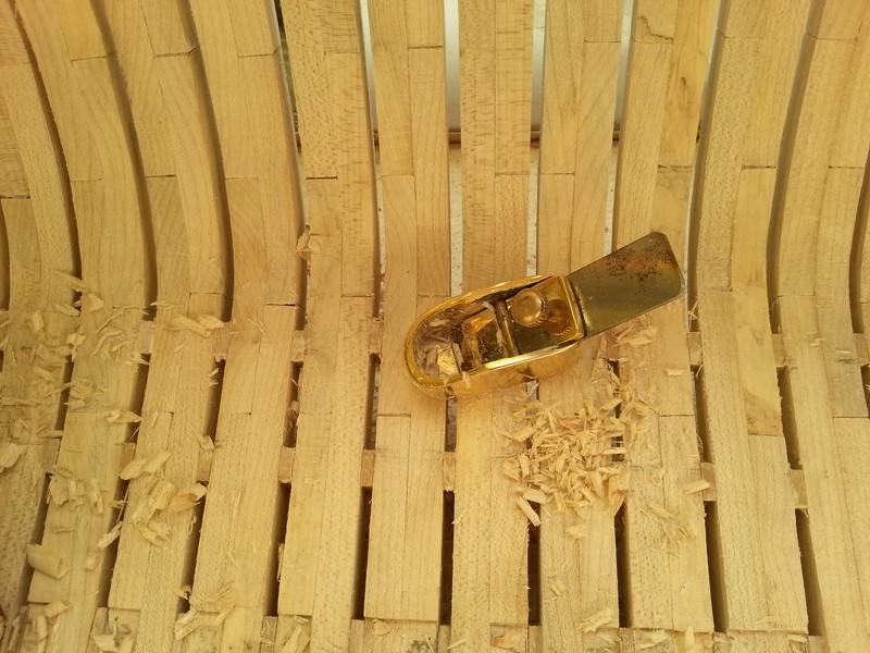 Wręgi są przyklejone, denne wzmoniemia międzywręgowe też są wklejone, a gumki to ciągle jeszcze stsbilizują. Hebelkami wolę wyrównywać niż kostką z grubym papierem ściernym. Po nich wystsrczy bardzo drobnym, zbierają po ok.0, 05 mm czyli niewiele. Skosy są już wyszlifowane wałkiem ściernym.