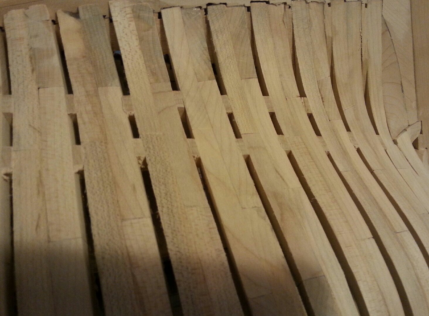 Tak jak napisałem kadłub wrócił do stoczni,Pozostanie tam dopóki nie przykleję części poszycia i listwy (belki) pod pokładniki. Kadłub cały czas pracuje pomimo pobytu w stoczni.Po zamocowaniu napiętego cienkiego drutu wzdłuż osi symetrii od czasu do czasu dokonuję pomiarów w wybranych punktach.Co do drewna to dalej pozostanę przy jaworze na elementy konstrukcyjne,poszycie zrobię z gruszy.
