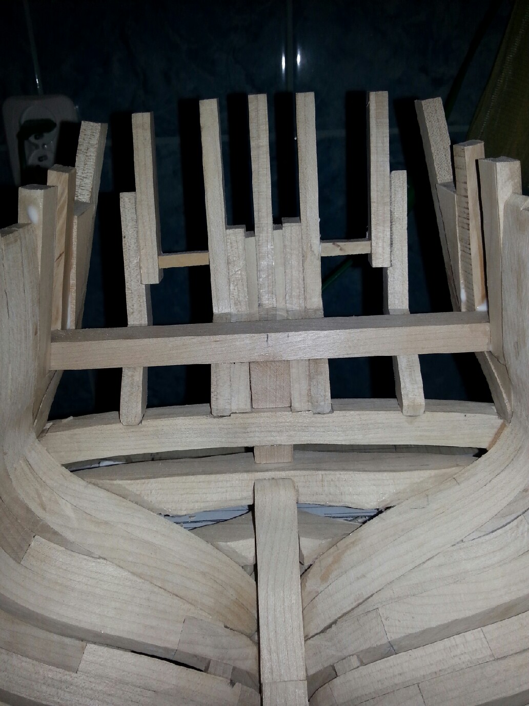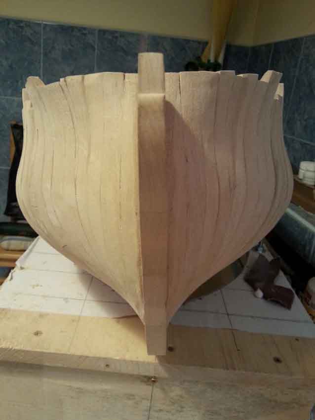 Zamieszczam nowe zdjęcie rufy. Wysokość elementów jest z niewielkim naddatkiem na doszlifowanie. To samo tyczy się kilku elementów wypełnienia burt w części rufowej.