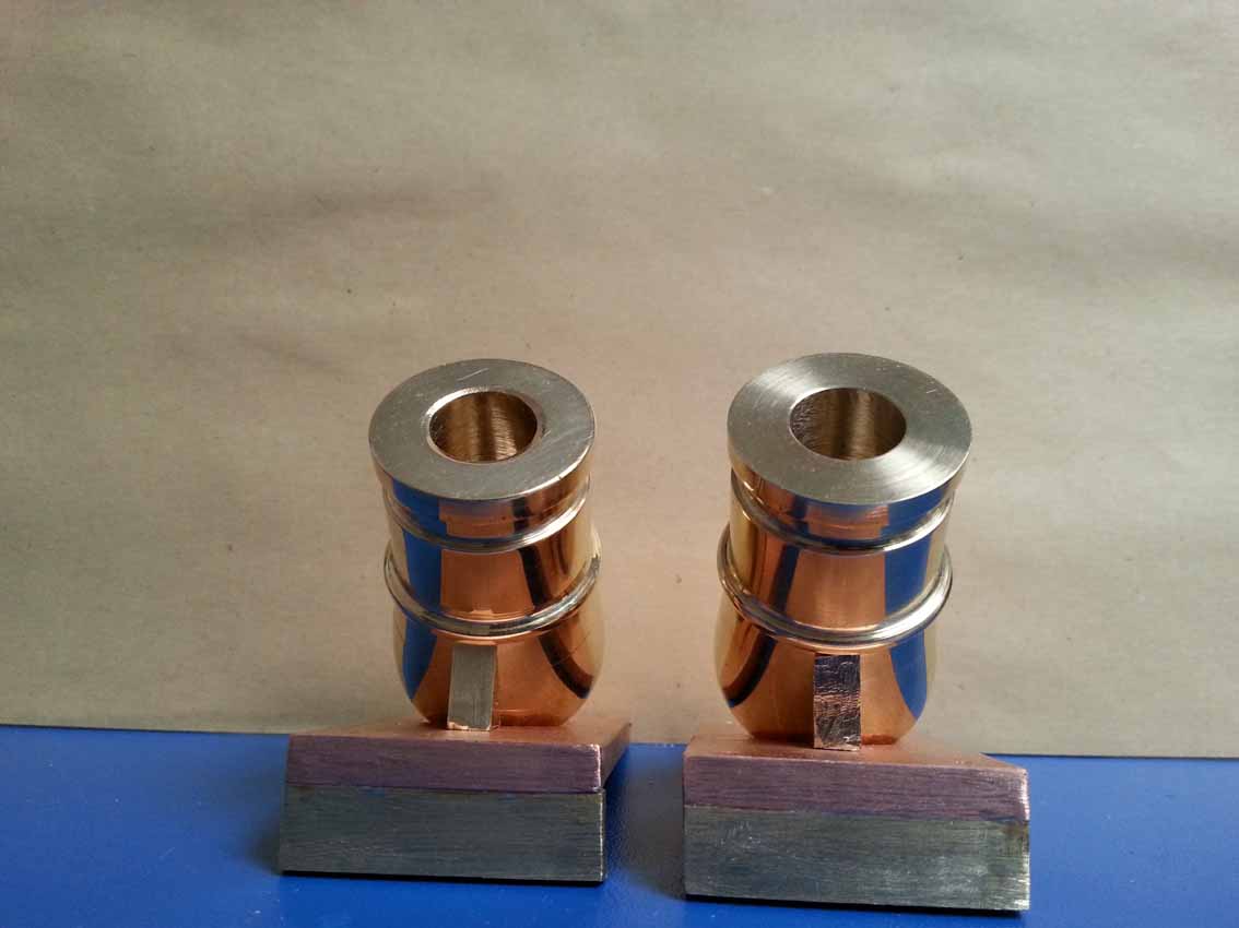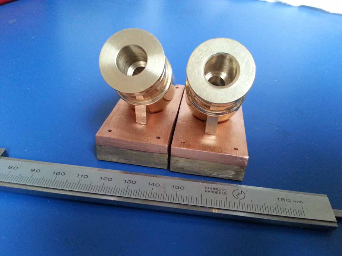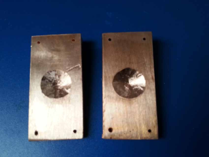 Zlutowane podstawy pod moździerze.Prowizoryczna przymiarka ustawienia moździerzy na podstawach. Przymocowane do podstaw za pomocą wosku.Podstawy zrobione z płaskownika miedzianego grubości 5 mm.