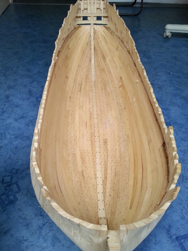 Poszycie wewnętrzne w części rufowej ukończone. Na dziobie pozostało dociąć i dokleić po trzy niewielkie fragmenty na burtę. Następnie szlifowanie i dokończenie gwoździowania.