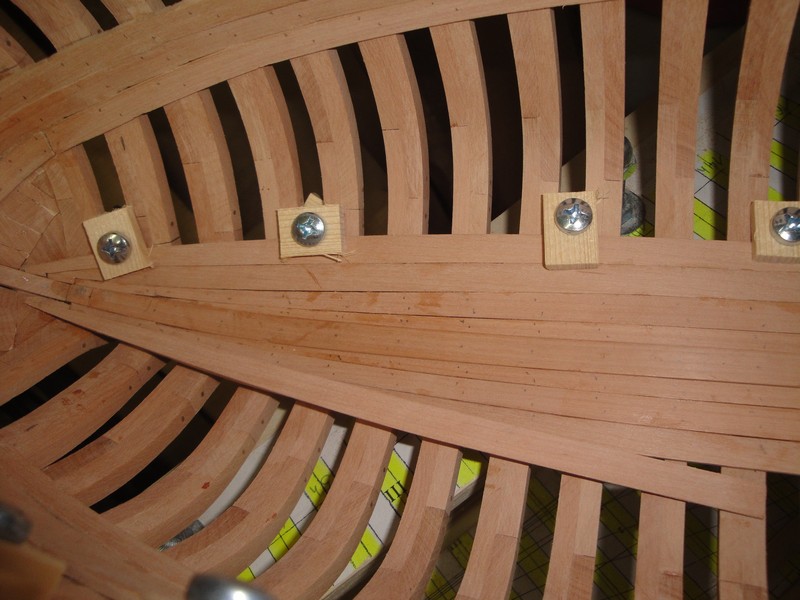 Dieki za uwagi i komentarze. Zabralem sie za wsporniki pod pokladniki (deski 9x3mm) oraz poszycie wewnetrzne (9x1,5mm). Stan surowy (slady kleju, nierownosci desek) bo wszystko po kolkowaniu bedzie i tak szlifowane. Pozycja otworow pod kolki zaznaczona olowkiem, jeszcze nie wywiercone.