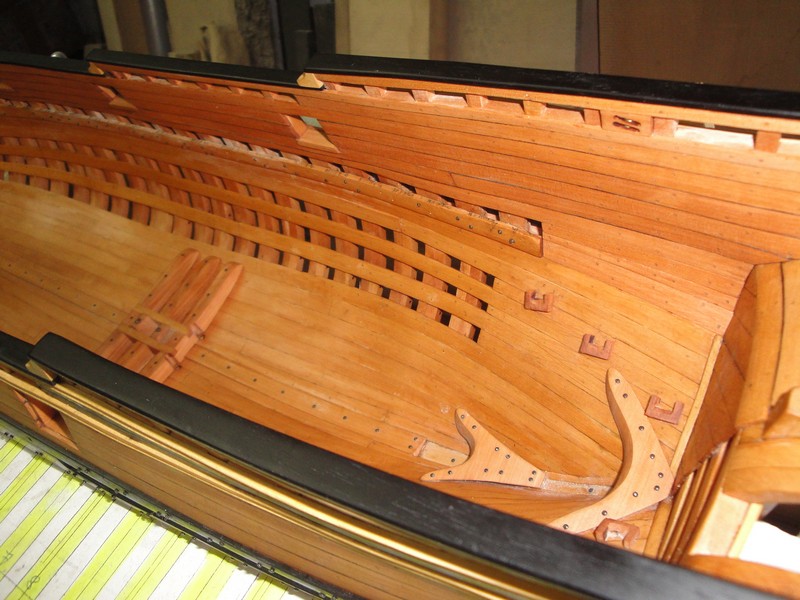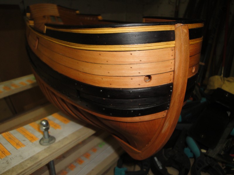 Skonczylem poszycie wewnetrzne i zewnetrzne. Jak widac na zalaczonych fotkach nie bedzie to model w konwencji admiralskiej ale tez nie calkowicie poszyty. Zdecydowalem sie na rozwiazanie posrednie, zeby moc pokazac mozliwie duzo wnetrza oraz wregi. Caly model zostal pokryty olejem lnianym.