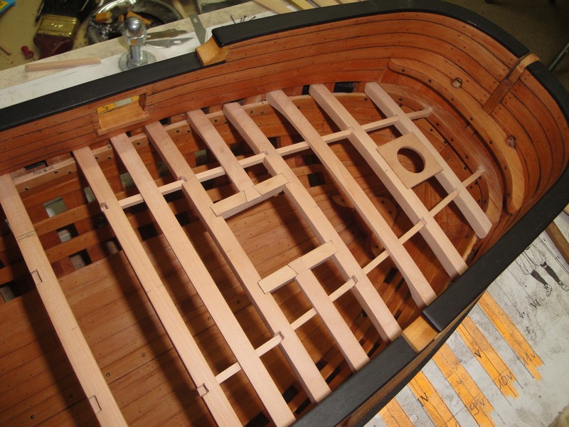 Ciag dalszy konstrukcji pokladu. Otwory do zamocowania belek laczacych pokladniki wycialem skomplikowanymi narzedziami: ostrza dlutowe OLFA (czesciowo zmodyfikowane-redukcja szerokosci ) oraz kwadratowy profil z zaostrzonym koncem. Cala konstrukcja na razie na sucho do dopasowania.