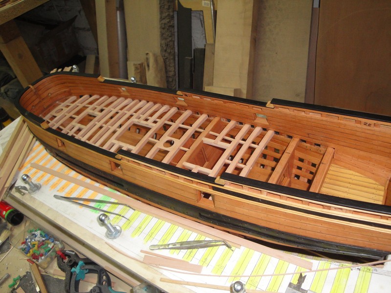 Wycialem i dopasowalem komplet pokladnikow. Pierwsza przymiarka na sucho. Trzeba jeszcze wystrugac poprzeczne elementy laczace i wsporniki pokladnikow.
