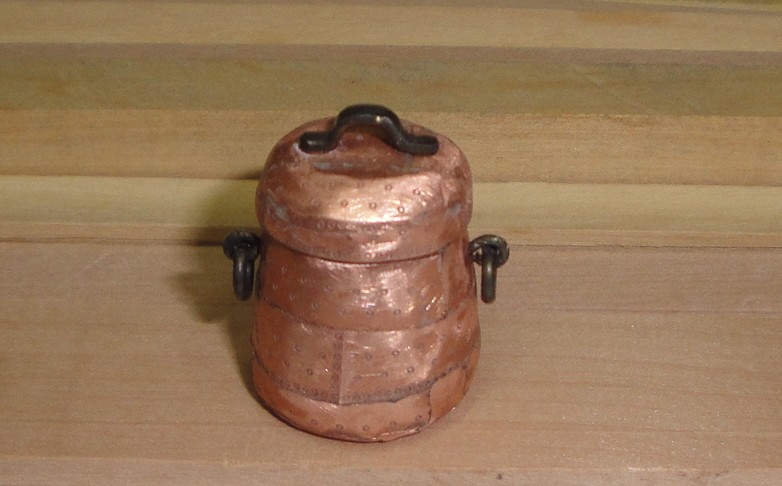 Poniewaz rzemieslnicy protestowali, ze nic rozsadnego do jedzenia nie dostaja, postanowilem zmajstrowac "kuchnie". Pod kociolek wystrugalem kopytko z drewna. Obkleilem kopyto blaszkami miedzianymi, ktore mi zostaly z pokrycia kadluba Merkurego. Troche pogliglowalem i wyszlo jak wyszlo.