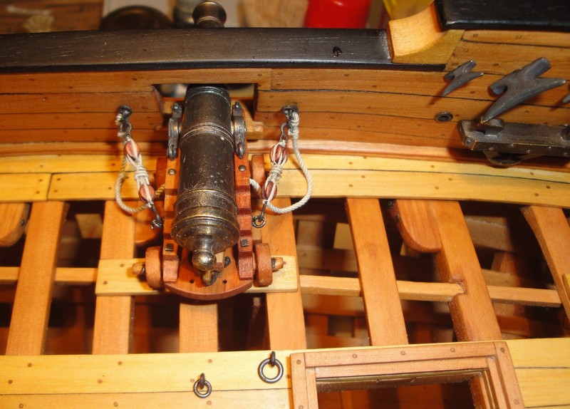 Piotr mial "pietra" (skad to powiedzenie pochodzi?), ze bedzie to widac. Okazalo sie, ze po zalozeniu linki, ktora wypelnila te rowki, nic nie bylo widac, i obawy moje sie nie spelnily. Ale z powrotem do tematu: odnosze subiektywne wrazenie, ze te bloczki sa troche za male w stosunku do lawet i dzial. Mialem akurat kilka bloczkow 5mm, ktore wyprobowalem. Bloczki sa jasne, bo grusza tylko pociagnieta olejem lnianym, ale to w tym momencie nie istotne. Nastepny problem: z powodu notorycznego braku miejsca, bloki 5mm prawie sie stykaja, co moze optycznie nie wszystkim sie podobac. Przesunalem zamocowania linek z blokami na lawetach do tylu, uzyskujac dodatkowe 6mm. Ponizsze fotki dokumentuja moje eksperymenty.