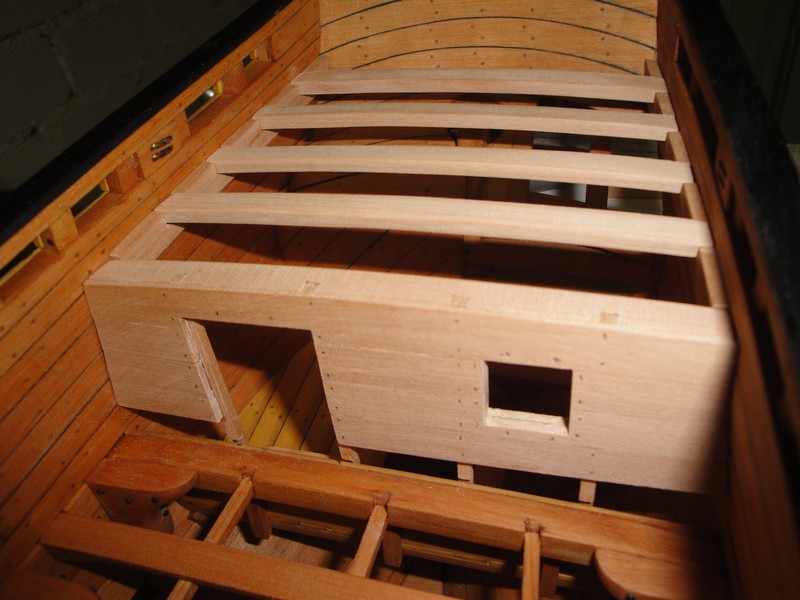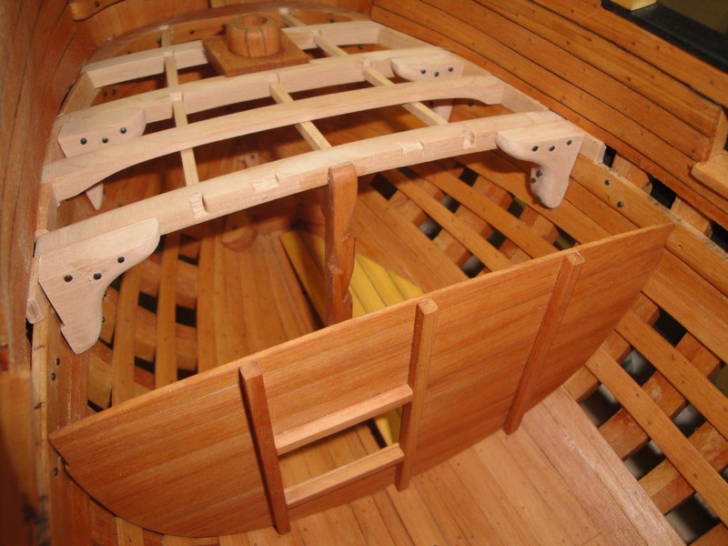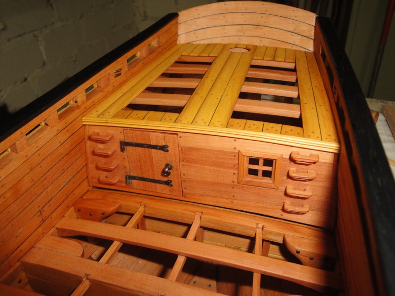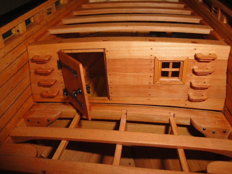 Przyszla kolej na kabine kapitanska. Zamocowalem pokladniki i skleilem scianke dzialowa. Drzwiczki sa stosunkowo niskie (ca 1m) ale nic na to nie poradze (tak jest na planach, na wiecej nie ma miejsca). Trzeba sie mocno schylac wchodzac do kabiny. Tyle na temat rozbierznosci miedzy planami i rzeczywistoscia. W miejscu styku scianki z burta przyjdzie jeszcze listwa dekoracyjna. Szczelina pod scianka przeznaczona jest na deski pokladu.