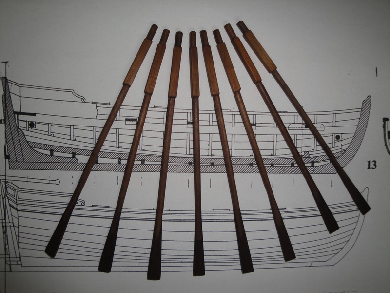 No to zrobilem ster i wystrugalem wiosla. Okucie steru z blaszki mosieznej 0,3mm, nity 0,5x3mm, srednica glowki 0,8mm, czernione jak zawsze kwasem selenawym. Wiosla maja dlugosc 12cm.