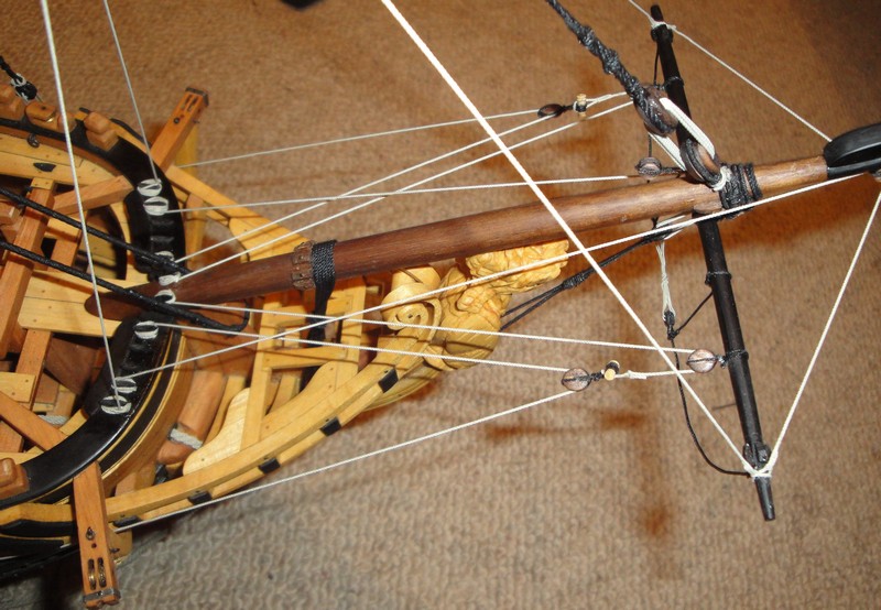 Ikemot, podstawa olinowania w ksiazce Peterssona byla angielska fregata "Melampus". Jean Boudriot opisuje w swoich ksiazkach (np 74-dzialowiec) jednostki francuskie. Nie wiem czy to jest powodem tej roznicy w olinowaniu. Poniewaz moj model, LB jest jednostka francuska, i w jej planach tez zostalo uzyte rozwiazanie podane przez Boudriota (jest on tez autorem tych planow), zastosowalem sie do reguly opierania sie na posiadanych planach (co nie musi znaczyc ze nie istnialy dwa rozwiazania:angielskie i francuskie).