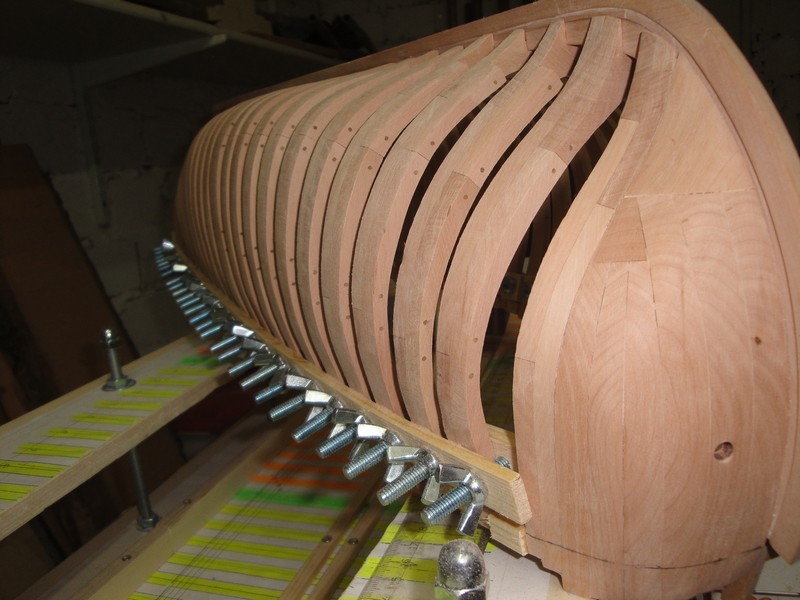 Dieki za uwagi i komentarze. Zabralem sie za wsporniki pod pokladniki (deski 9x3mm) oraz poszycie wewnetrzne (9x1,5mm). Stan surowy (slady kleju, nierownosci desek) bo wszystko po kolkowaniu bedzie i tak szlifowane. Pozycja otworow pod kolki zaznaczona olowkiem, jeszcze nie wywiercone.