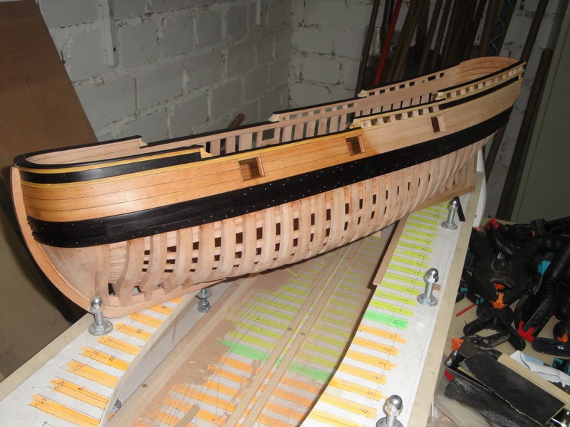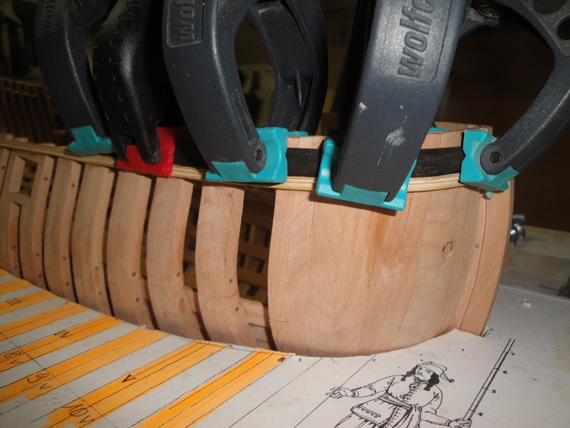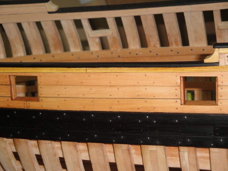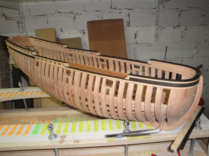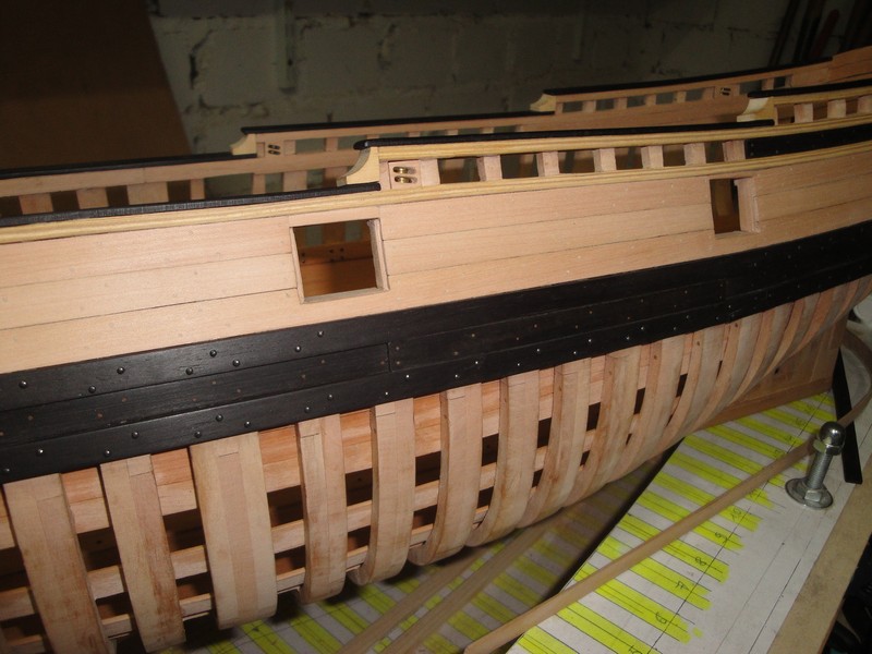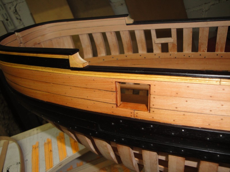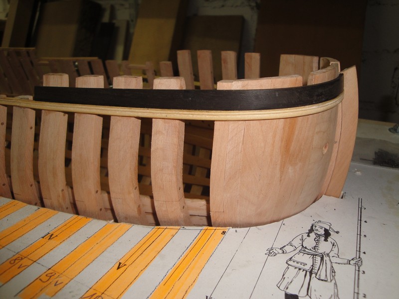 Przede wszystkim dziekuje za uwagi i uwazne sledzenie relacji. Na planach, trzy gorne planki powyzej odbojnicy sa z jednego kawalka drewna. LB, pomimo ze byla mala jednostka, miala ok. 15m dlugosci (od dzioba do rufy). Nie jest mi znane, zeby do budowy uzywano takich dlugich desek (przecietnie ca 6m), czyli jakies polaczenia musialy byc. Wszystkie planki ponizej odbojnicy sa laczone. Tyle na temat planow.