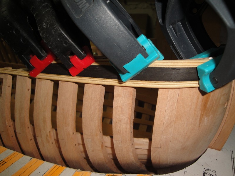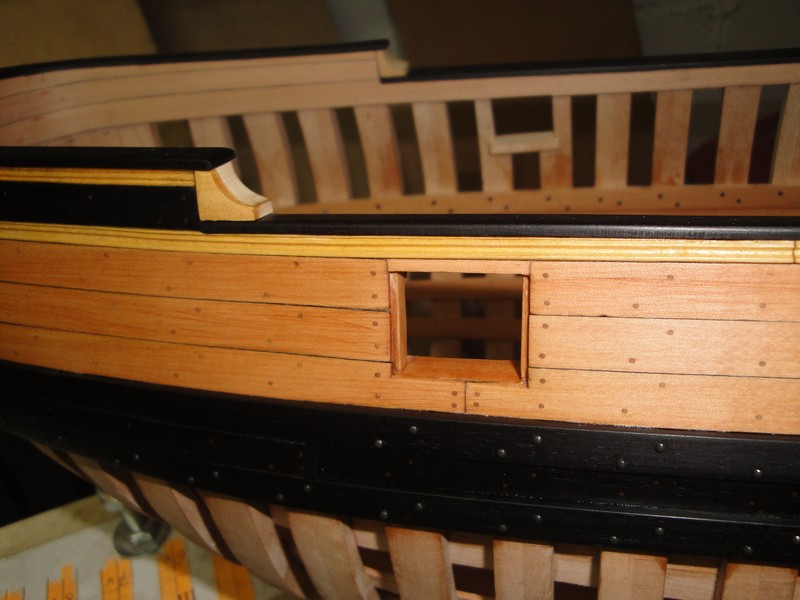 Ciag dalszy prac przy zewnetrznych burtach: gorne poszycie i odbojnice. Dla proby, czesc pokrylem olejem lnianym.