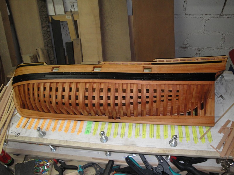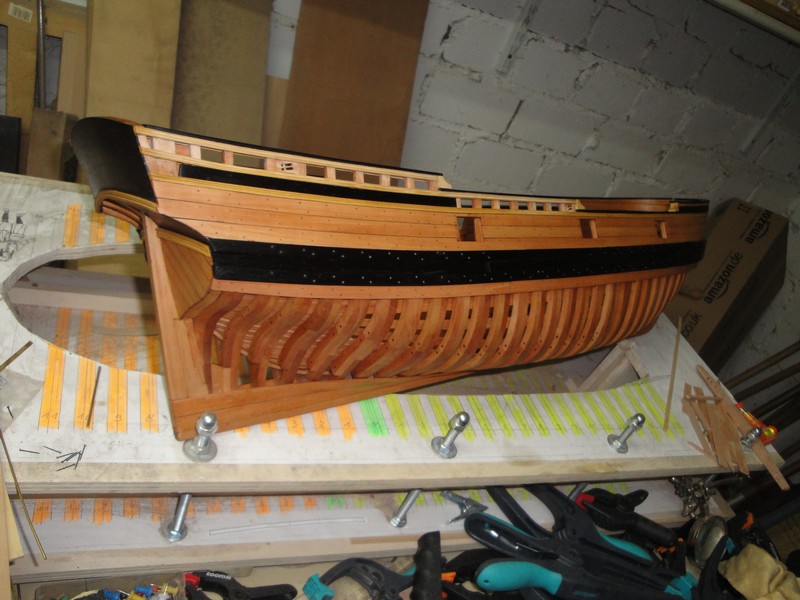 Skonczylem poszycie wewnetrzne i zewnetrzne. Jak widac na zalaczonych fotkach nie bedzie to model w konwencji admiralskiej ale tez nie calkowicie poszyty. Zdecydowalem sie na rozwiazanie posrednie, zeby moc pokazac mozliwie duzo wnetrza oraz wregi. Caly model zostal pokryty olejem lnianym.