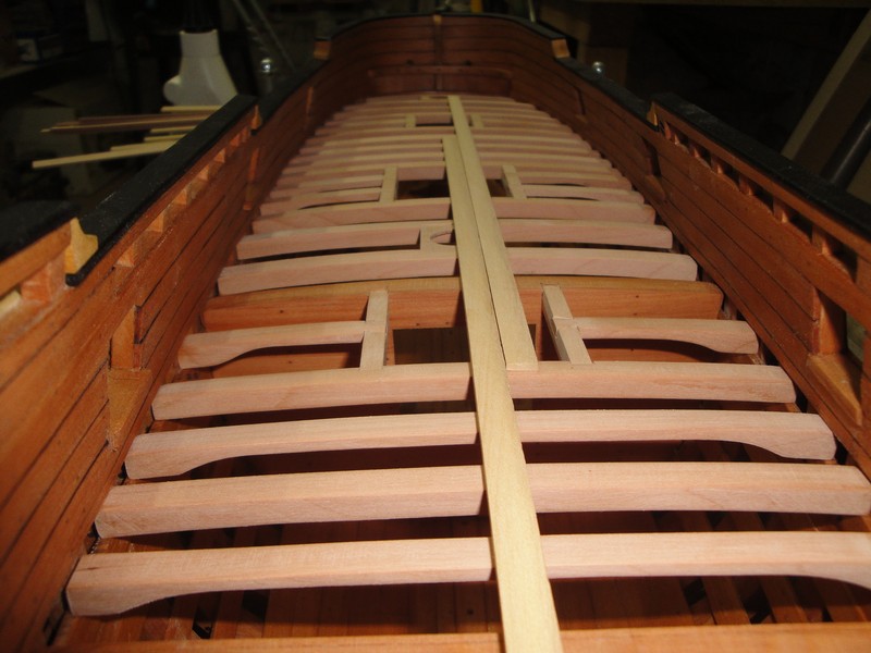 Wycialem i dopasowalem komplet pokladnikow. Pierwsza przymiarka na sucho. Trzeba jeszcze wystrugac poprzeczne elementy laczace i wsporniki pokladnikow.