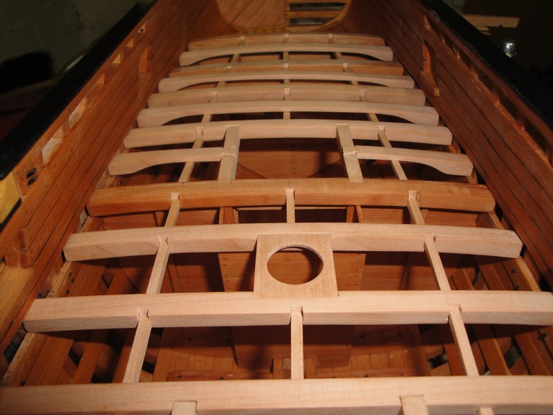Ciag dalszy konstrukcji pokladu. Otwory do zamocowania belek laczacych pokladniki wycialem skomplikowanymi narzedziami: ostrza dlutowe OLFA (czesciowo zmodyfikowane-redukcja szerokosci ) oraz kwadratowy profil z zaostrzonym koncem. Cala konstrukcja na razie na sucho do dopasowania.