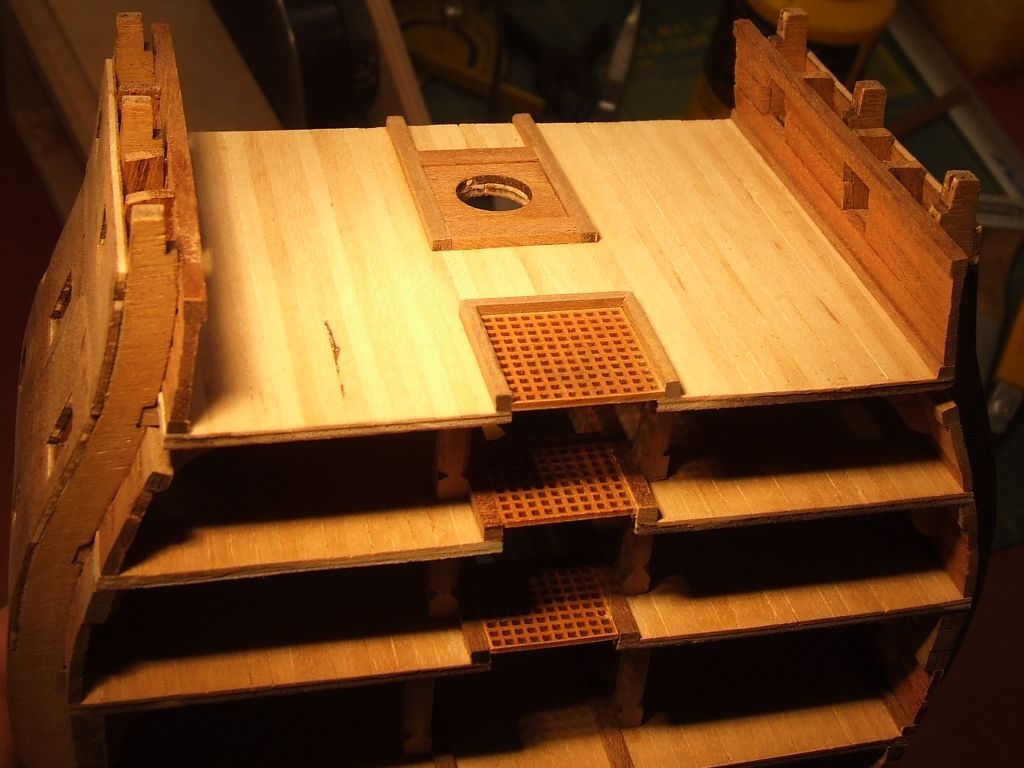 Pierwszy i nie ostatni poważny błąd. Listwy pokładowe przyklejone zostały na jeden z półpokładów nie z tej strony. Oderwanie po klejeniu Pattexem jest niemożliwe. Zrobiłem drugi pokład z kartonu.