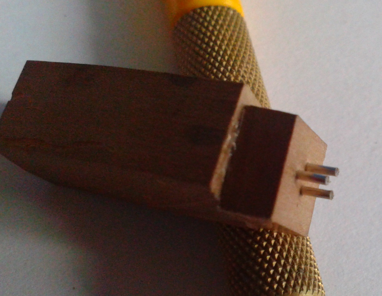 Listwa wyprofilowana w kształt bloczka:Frez piłkowy zamocowany w pilarce. Wyregulowana wysokość i ogranicznik:I wycięty w ten sposób rowek:Odcięte bloczki z rowkami:Wiercenie otworów z użyciem prostego szablonu:A to uchwyt do bloczków na czas szlifowania. Trzy szpilki umieszczone w kawałku drewienka z otworami wywierconymi wg. poprzedniego szablonu:I gotowe Jufersy, przed barwieniem:Oczywiście to nic odkrywczego, ale postanowiłem to zamieścić na forum, może przyda się komuś, kto ma ambicje wykonać bloczki samodzielnie