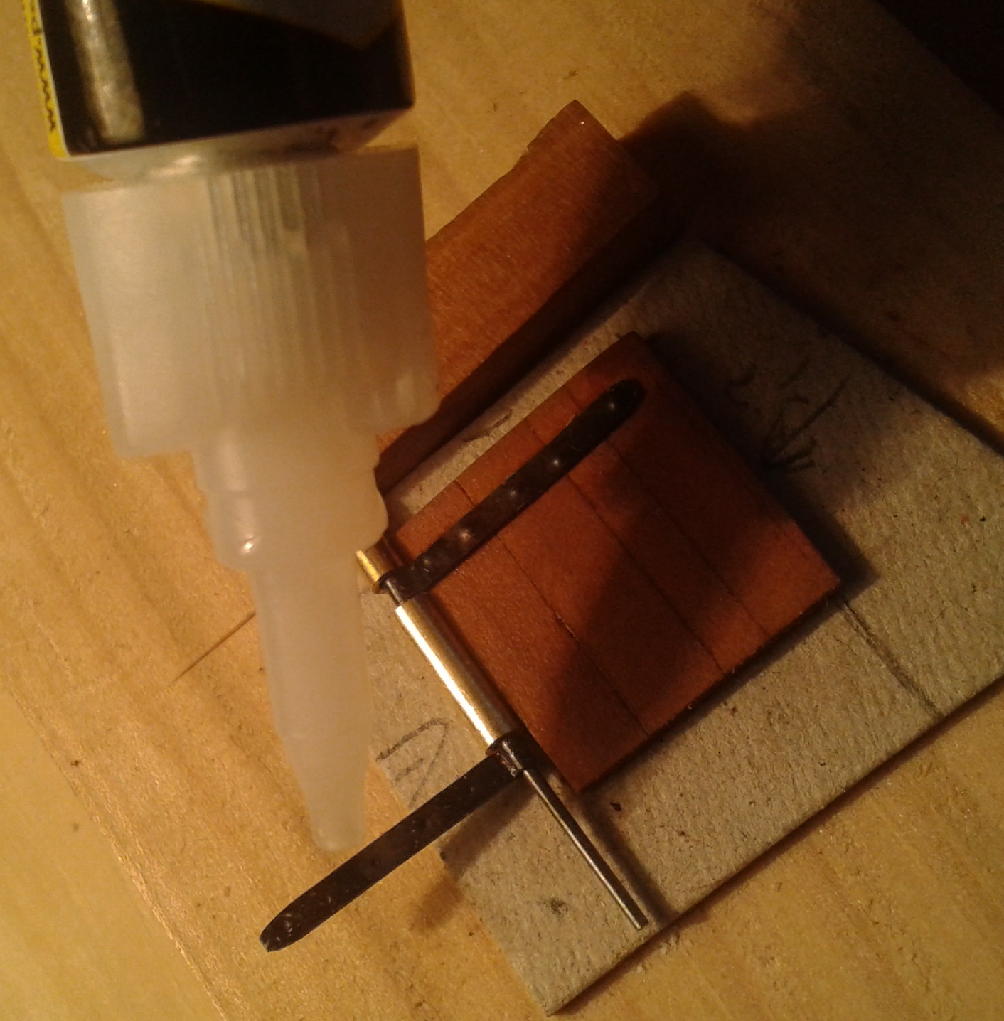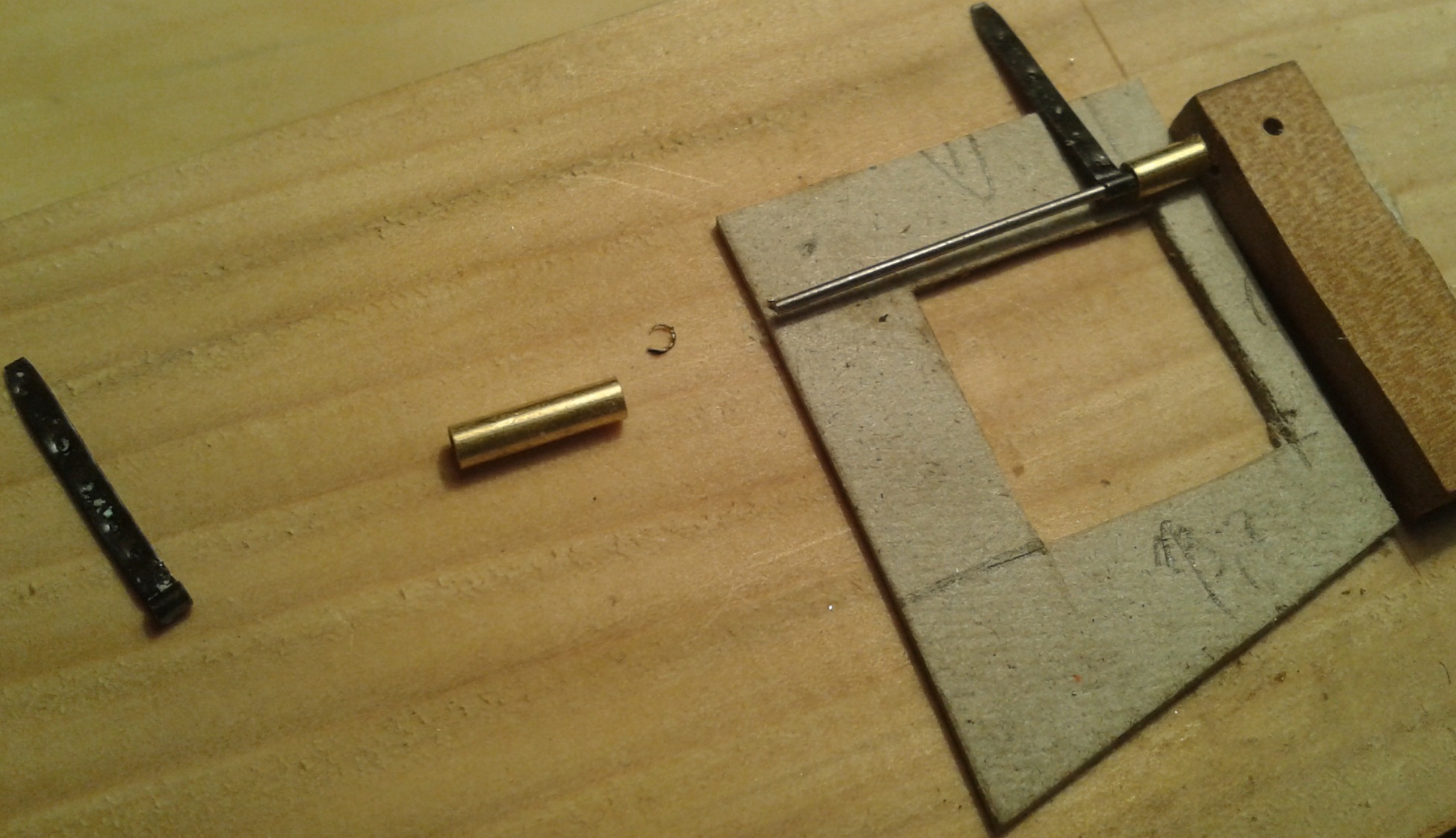 Kadłub Batavii stoi i czeka na detale:W celu zachowania powtarzalności szybko powstał prosty przyrząd do klejenia zawiasów: