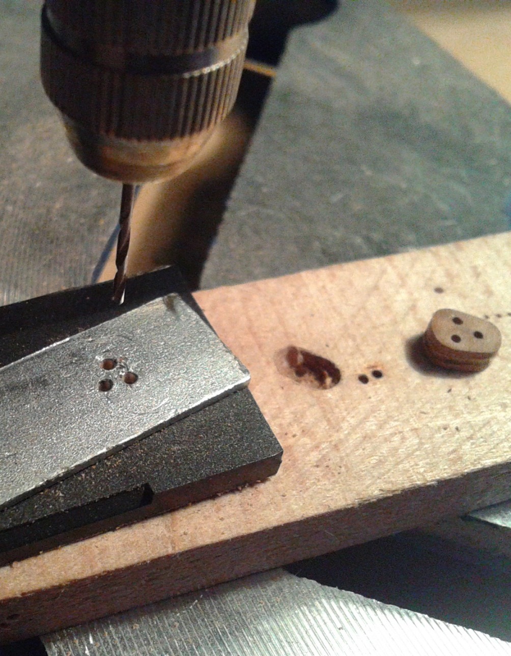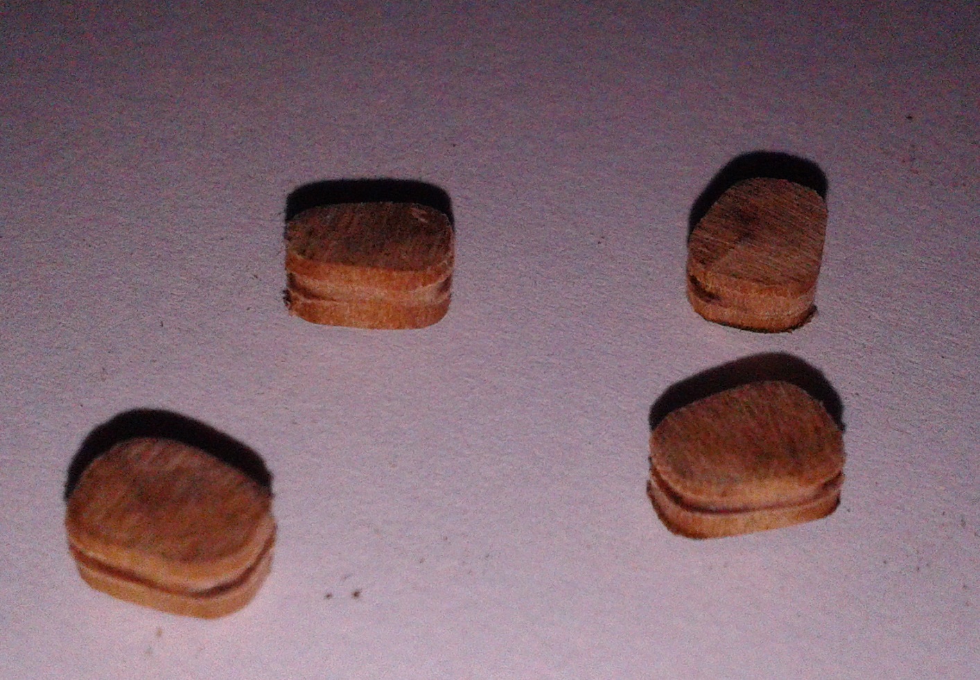 Listwa wyprofilowana w kształt bloczka:Frez piłkowy zamocowany w pilarce. Wyregulowana wysokość i ogranicznik:I wycięty w ten sposób rowek:Odcięte bloczki z rowkami:Wiercenie otworów z użyciem prostego szablonu:A to uchwyt do bloczków na czas szlifowania. Trzy szpilki umieszczone w kawałku drewienka z otworami wywierconymi wg. poprzedniego szablonu:I gotowe Jufersy, przed barwieniem:Oczywiście to nic odkrywczego, ale postanowiłem to zamieścić na forum, może przyda się komuś, kto ma ambicje wykonać bloczki samodzielnie