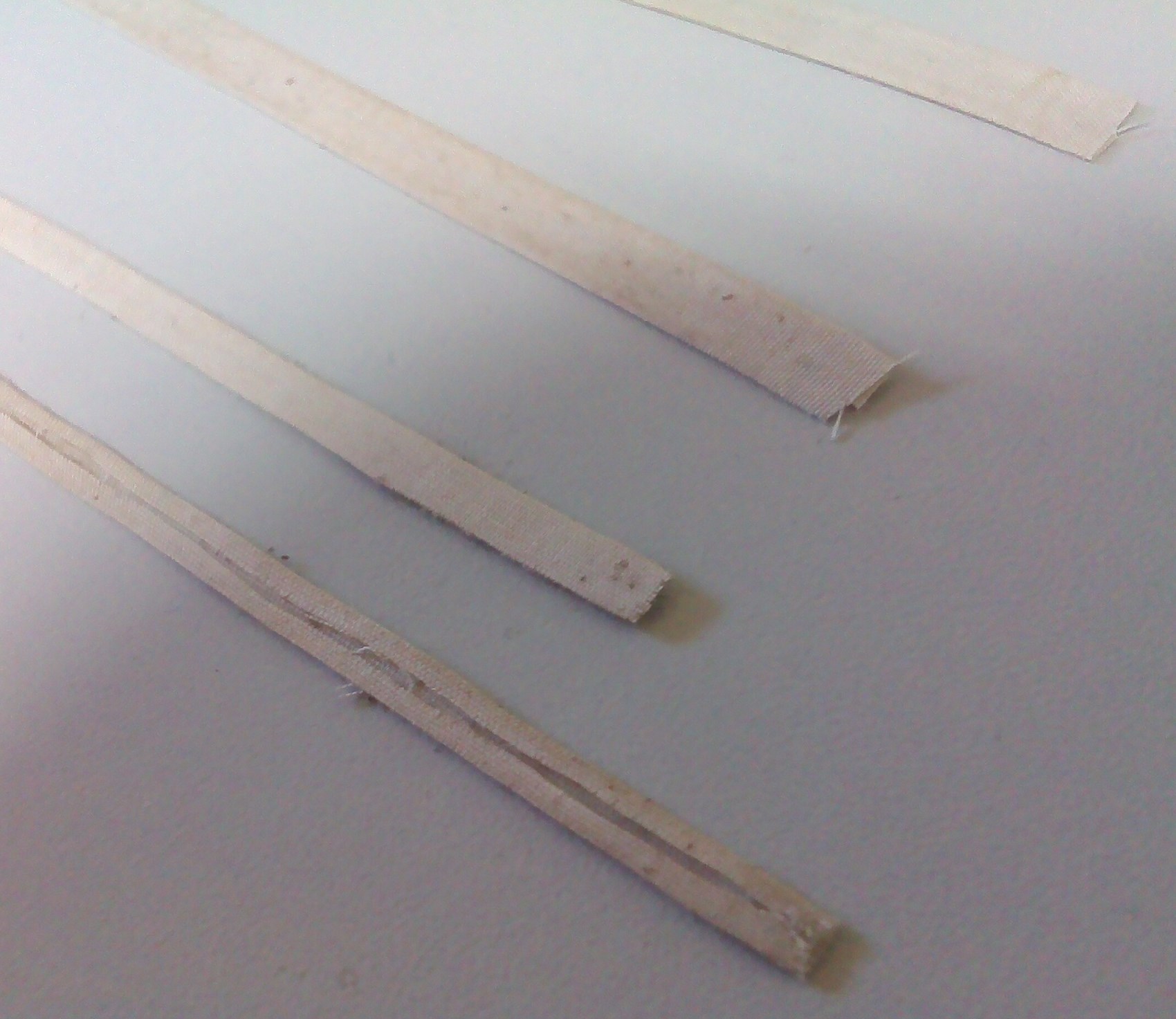 Podobną metodą wykonuję też pewną ilość pasków. Te węższe na wzmocnienia biegnące przez całą szerokość żagla, te szersze na narożniki: