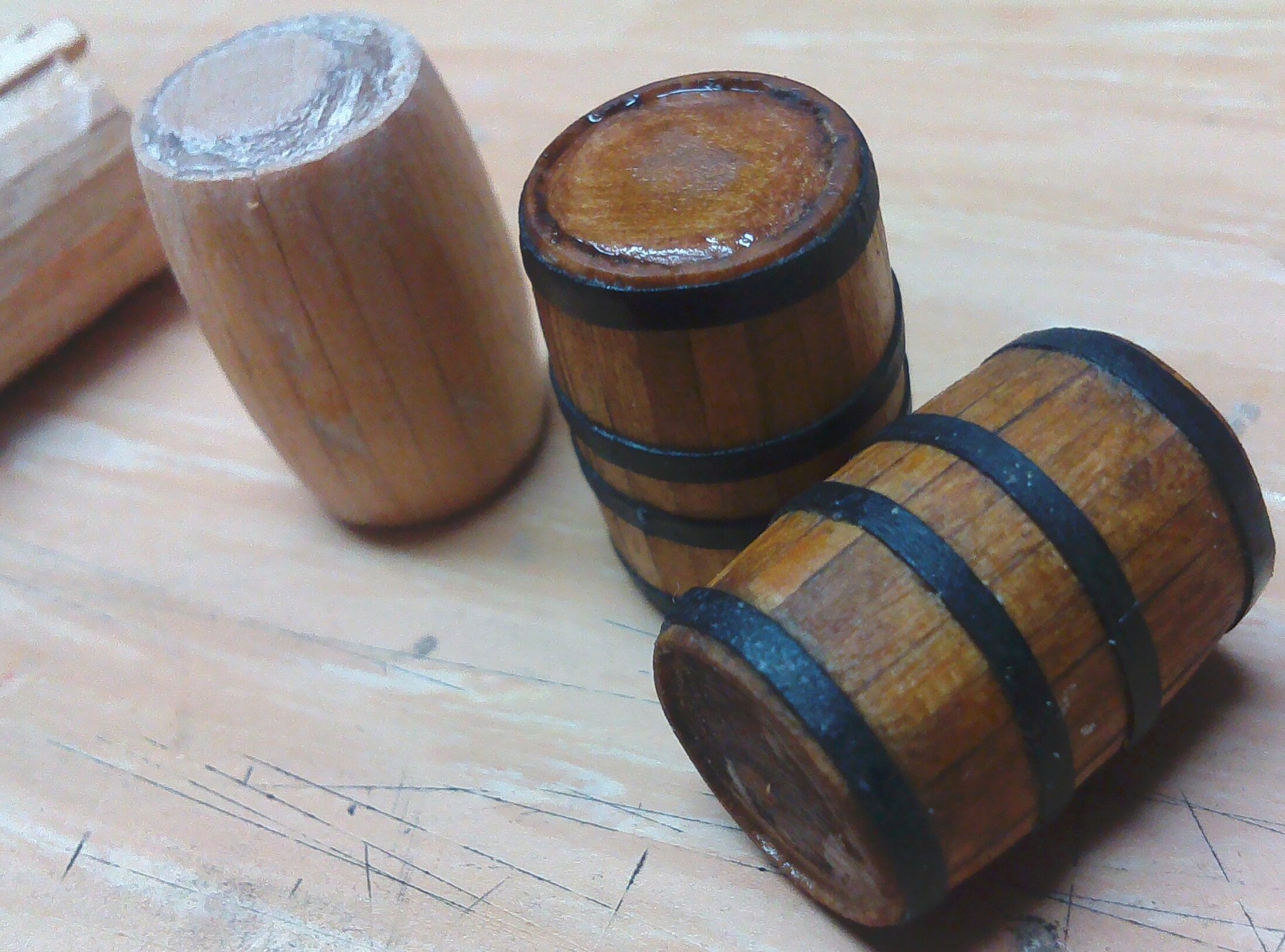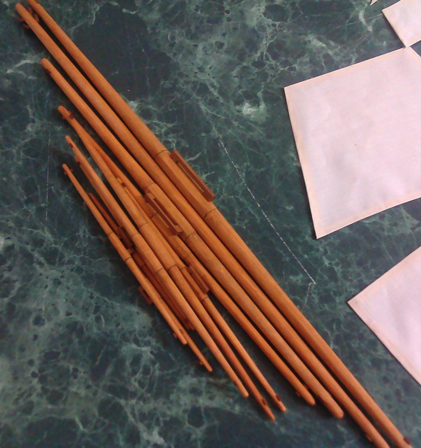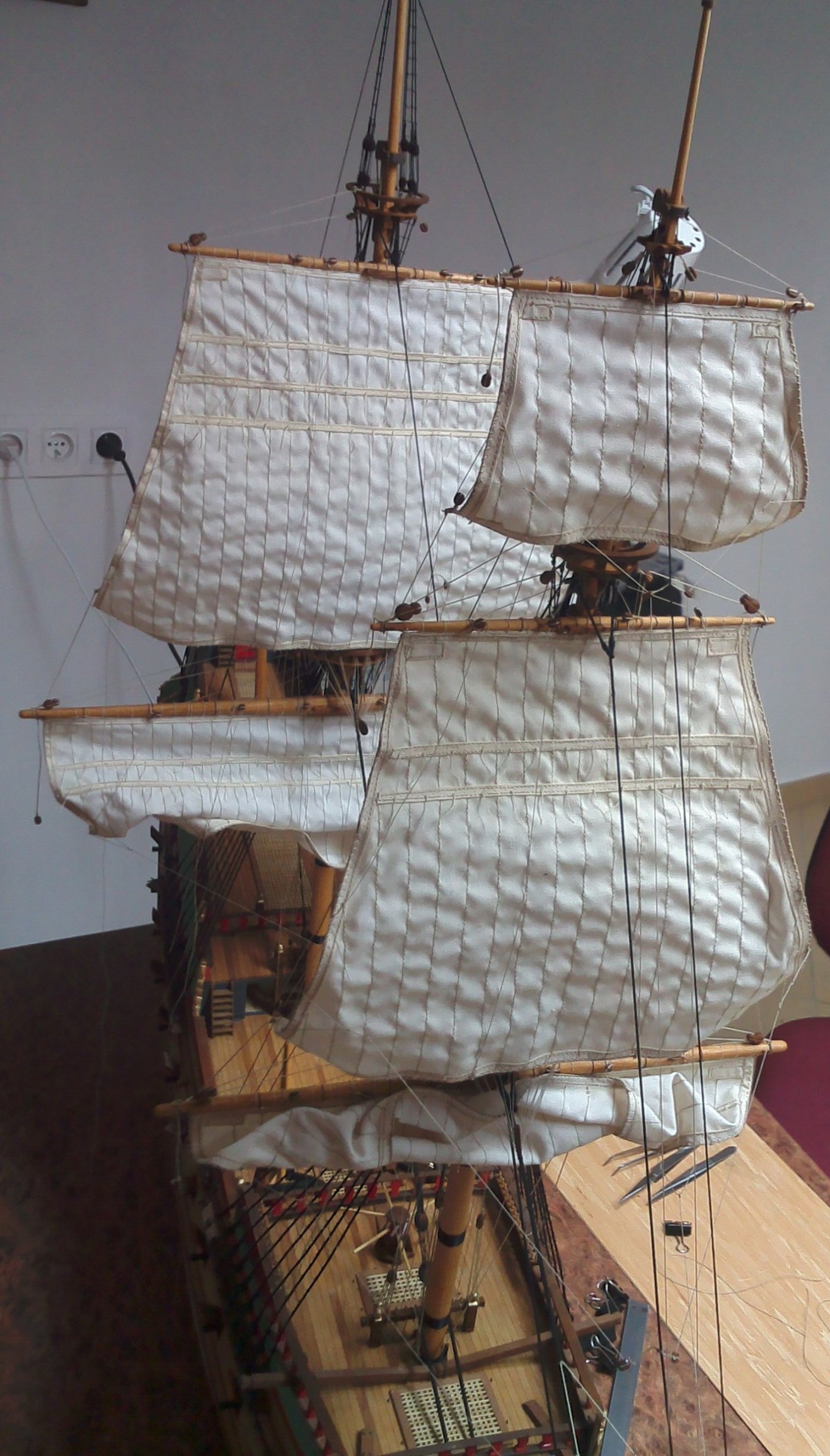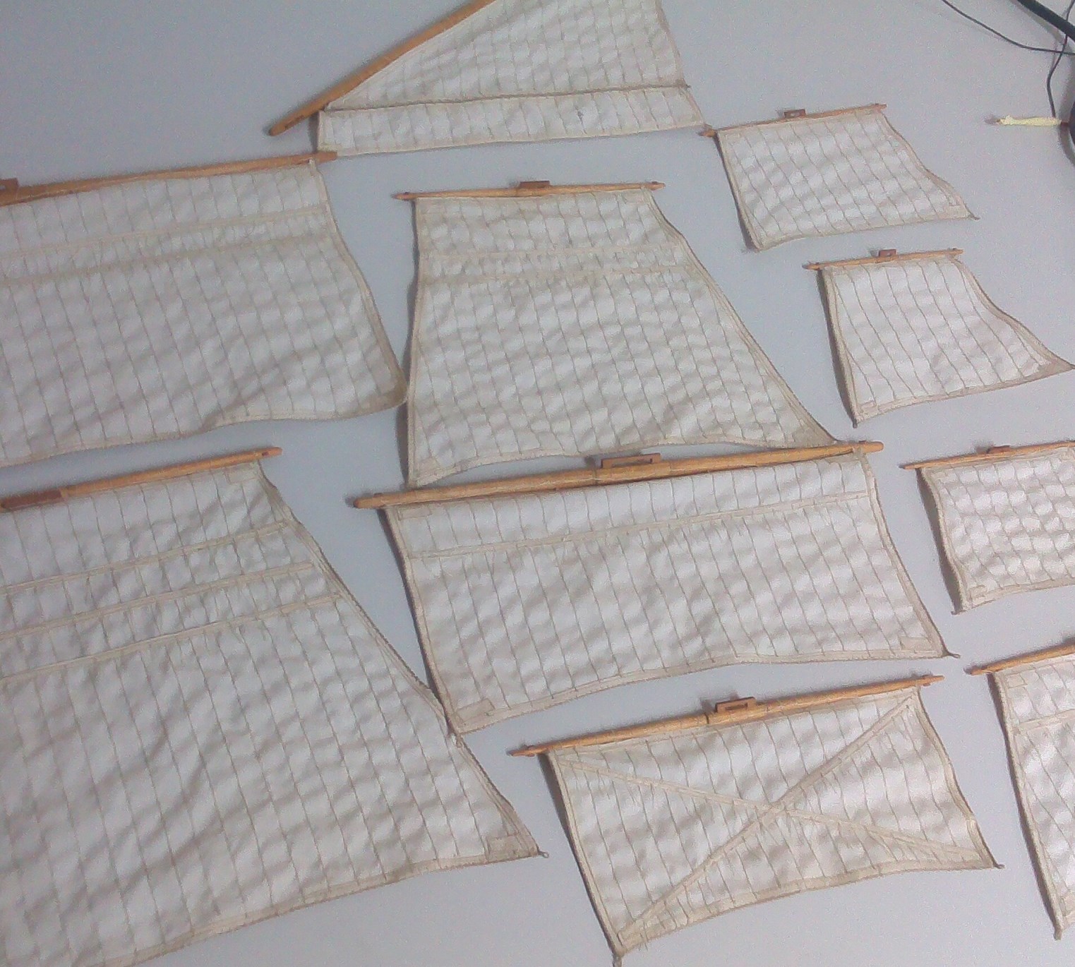 Tak wykonane żagle lądują w pudełku, bo chwilowo nie dysponuję maszyną do szycia. Dodam jeszcze, że fokżagiel i grotżagiel wykonałem o 15% krótsze, gdyż będą one częściowo zrefowane. Pozwoli to uzyskać nieco bardziej naturalny ich wygląd.