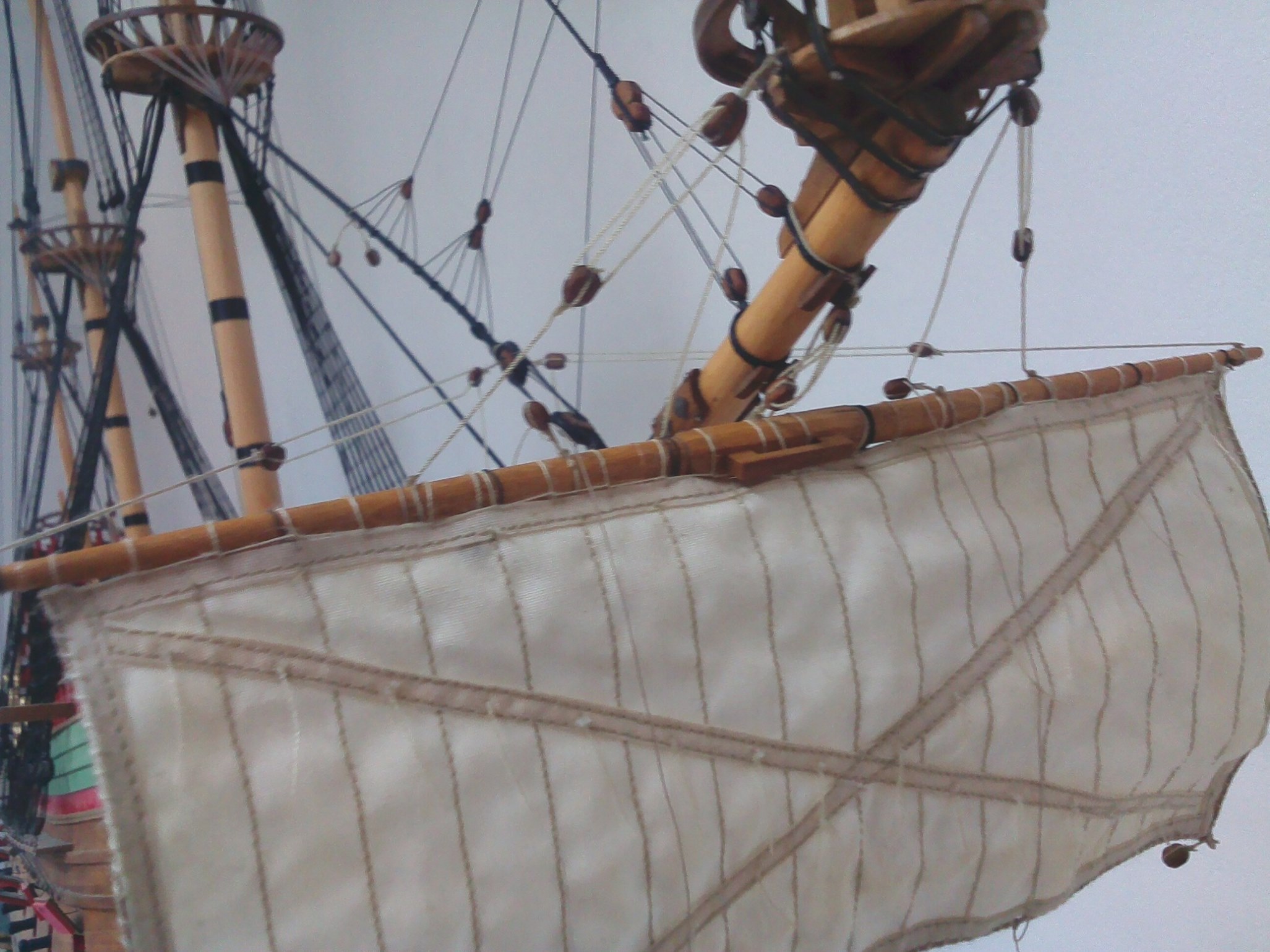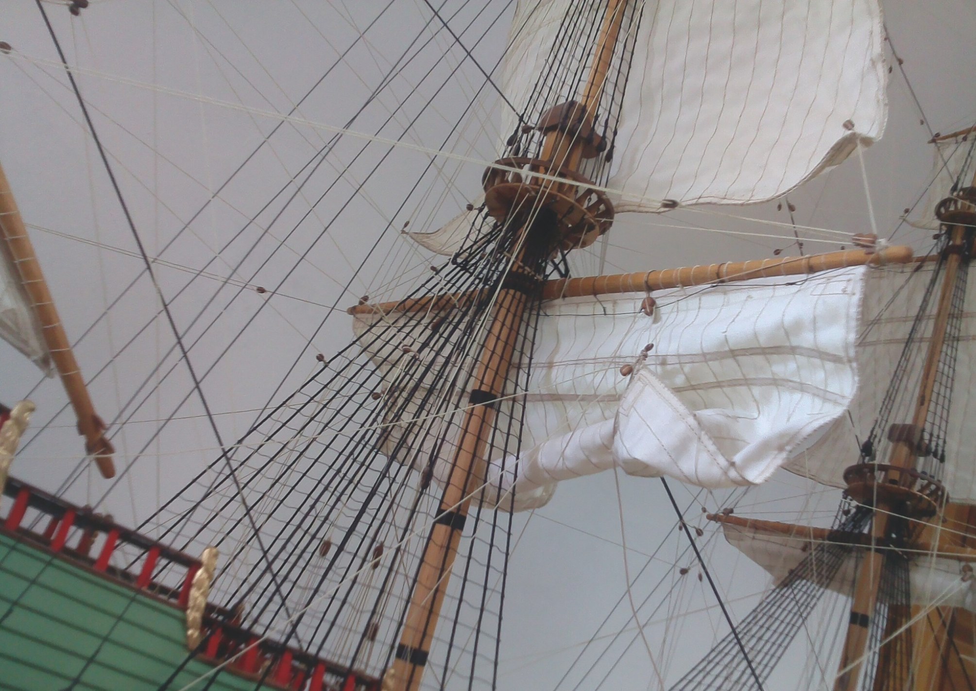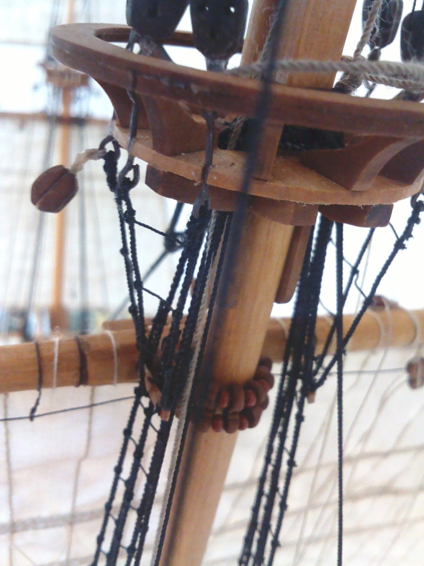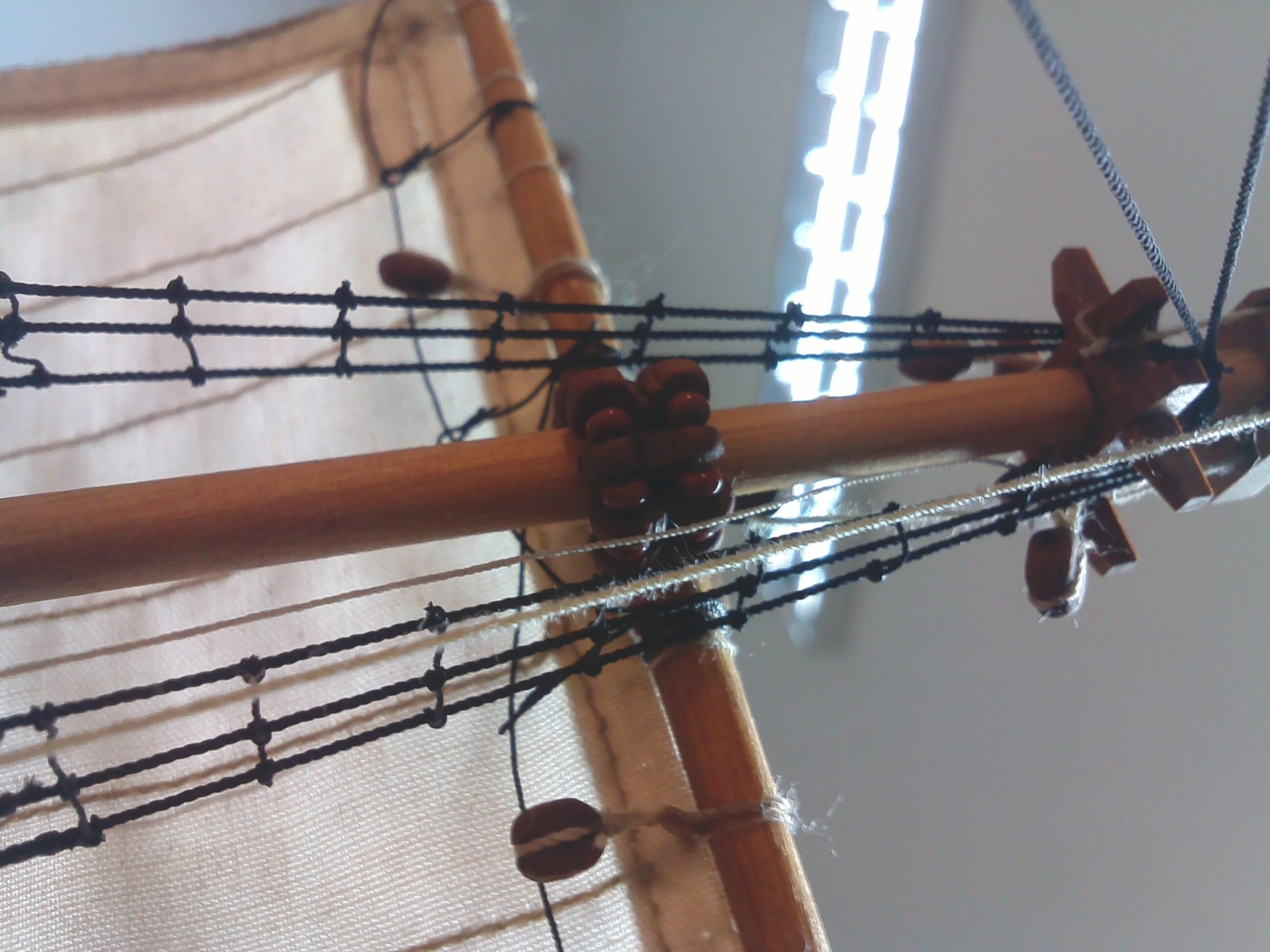 Witam. Prace przy olinowaniu stałym dobiegły końca. Było trochę problemów z odpowiednim naprężeniem głównie want. Niestety liny z nici poliestrowych zachowują się różnie w zależności od temperatury i wilgotności otoczenia. Nie wiem, jak to wygląda w przypadku lin bawełnianych, bo dotąd ich nie używałem. Parę zdjęć: