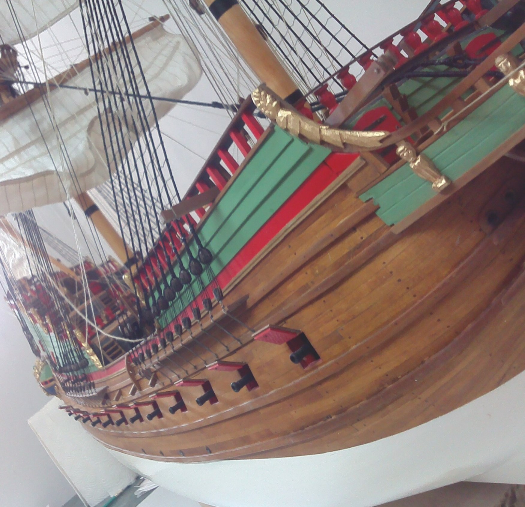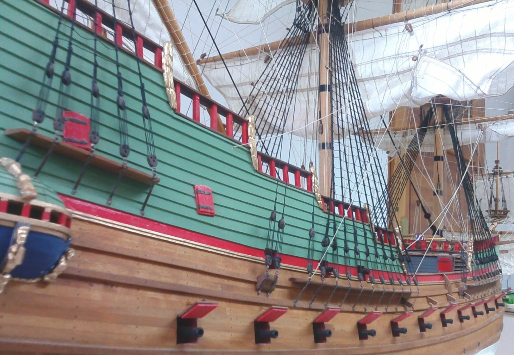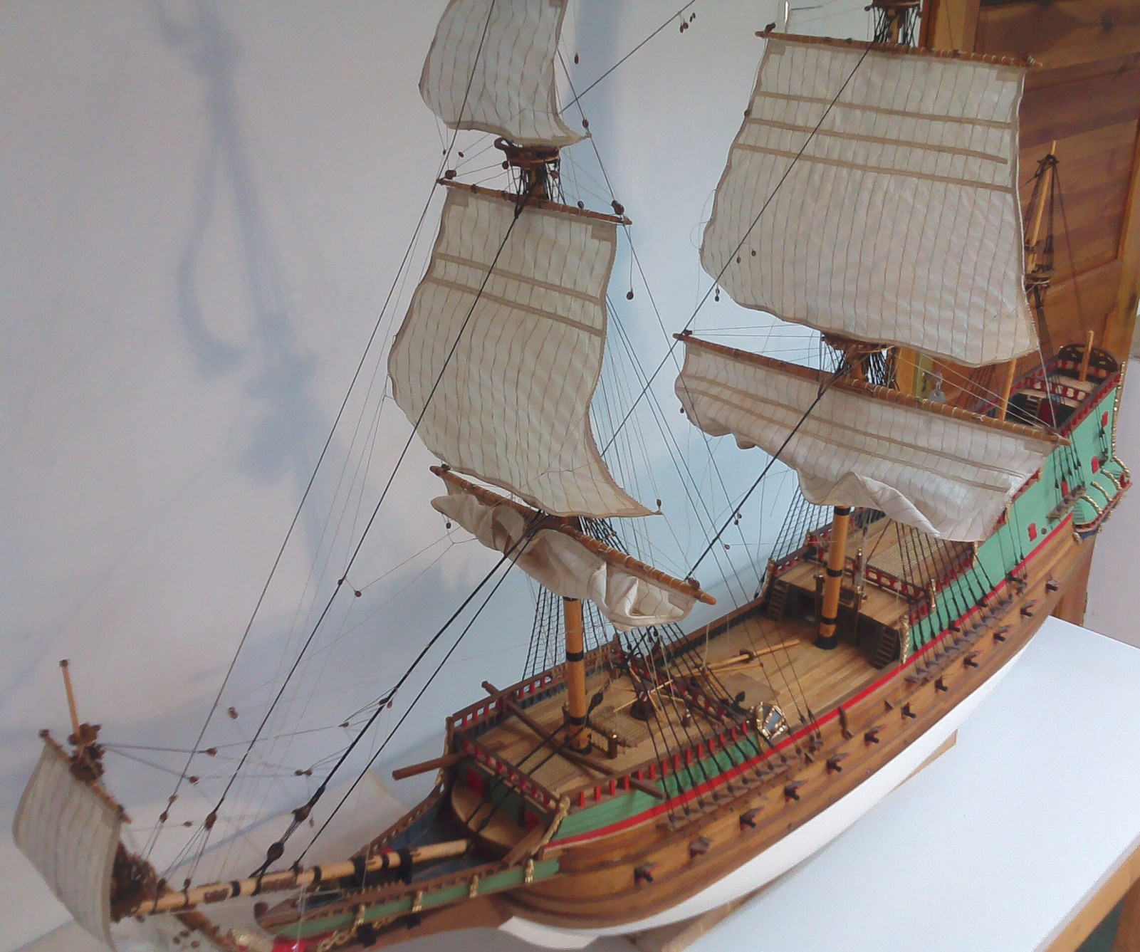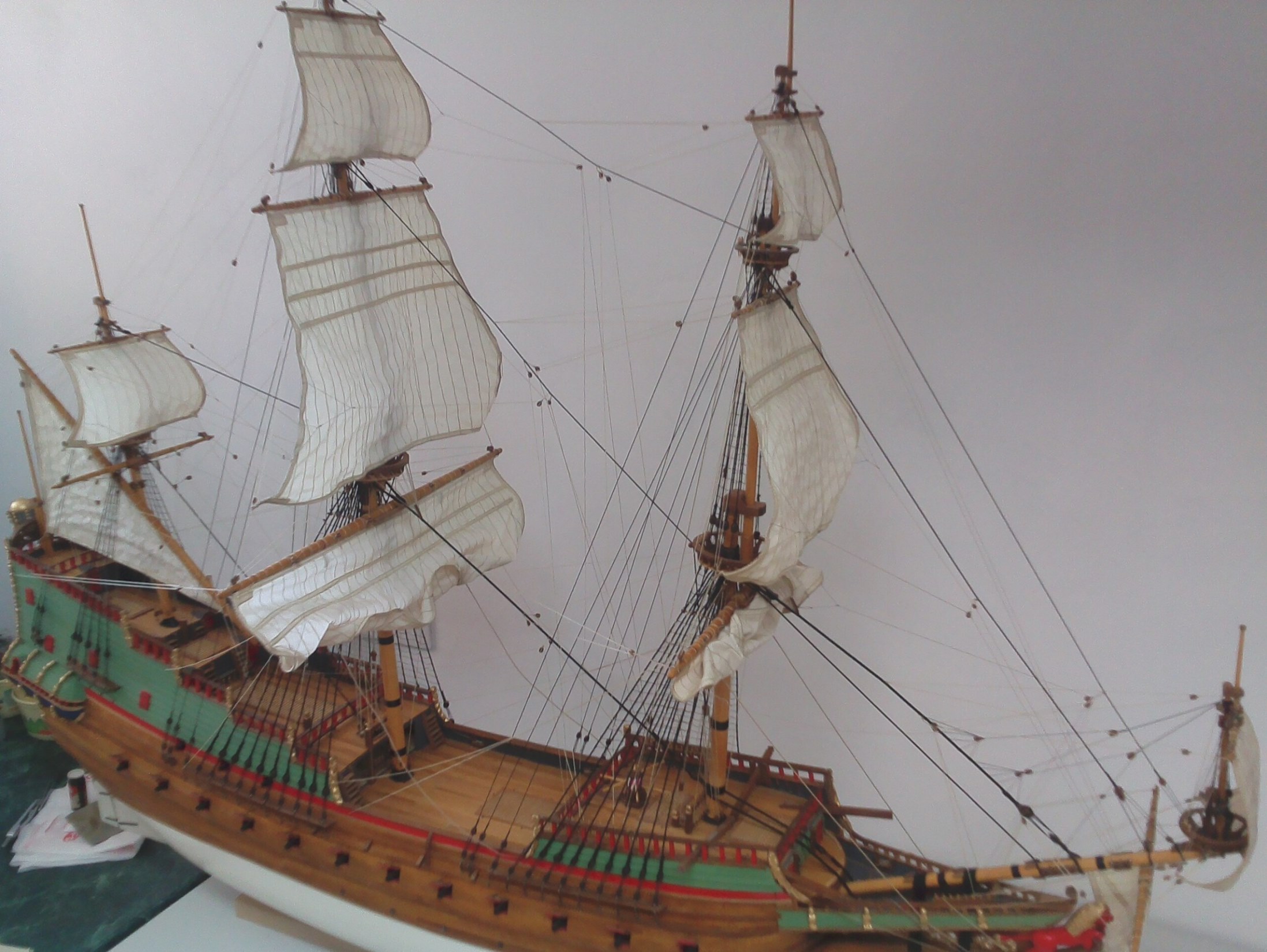 Witam. Prace przy olinowaniu stałym dobiegły końca. Było trochę problemów z odpowiednim naprężeniem głównie want. Niestety liny z nici poliestrowych zachowują się różnie w zależności od temperatury i wilgotności otoczenia. Nie wiem, jak to wygląda w przypadku lin bawełnianych, bo dotąd ich nie używałem. Parę zdjęć: