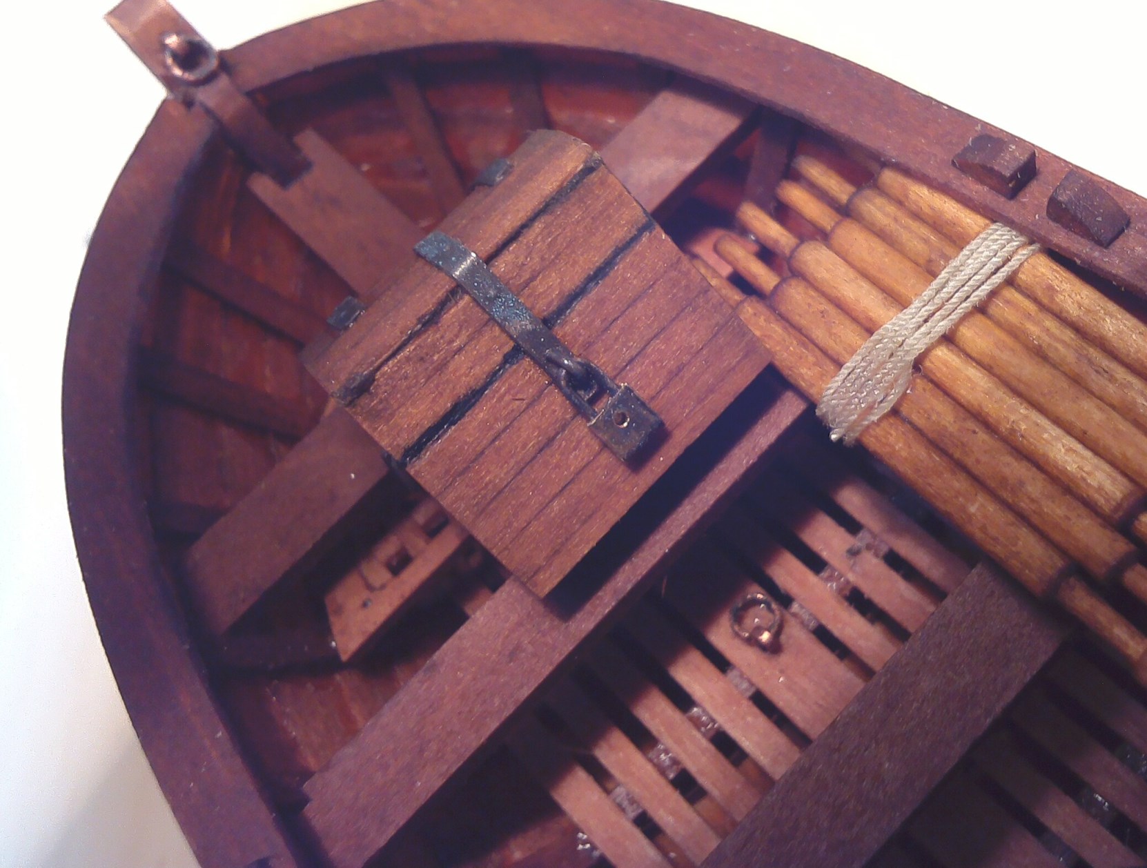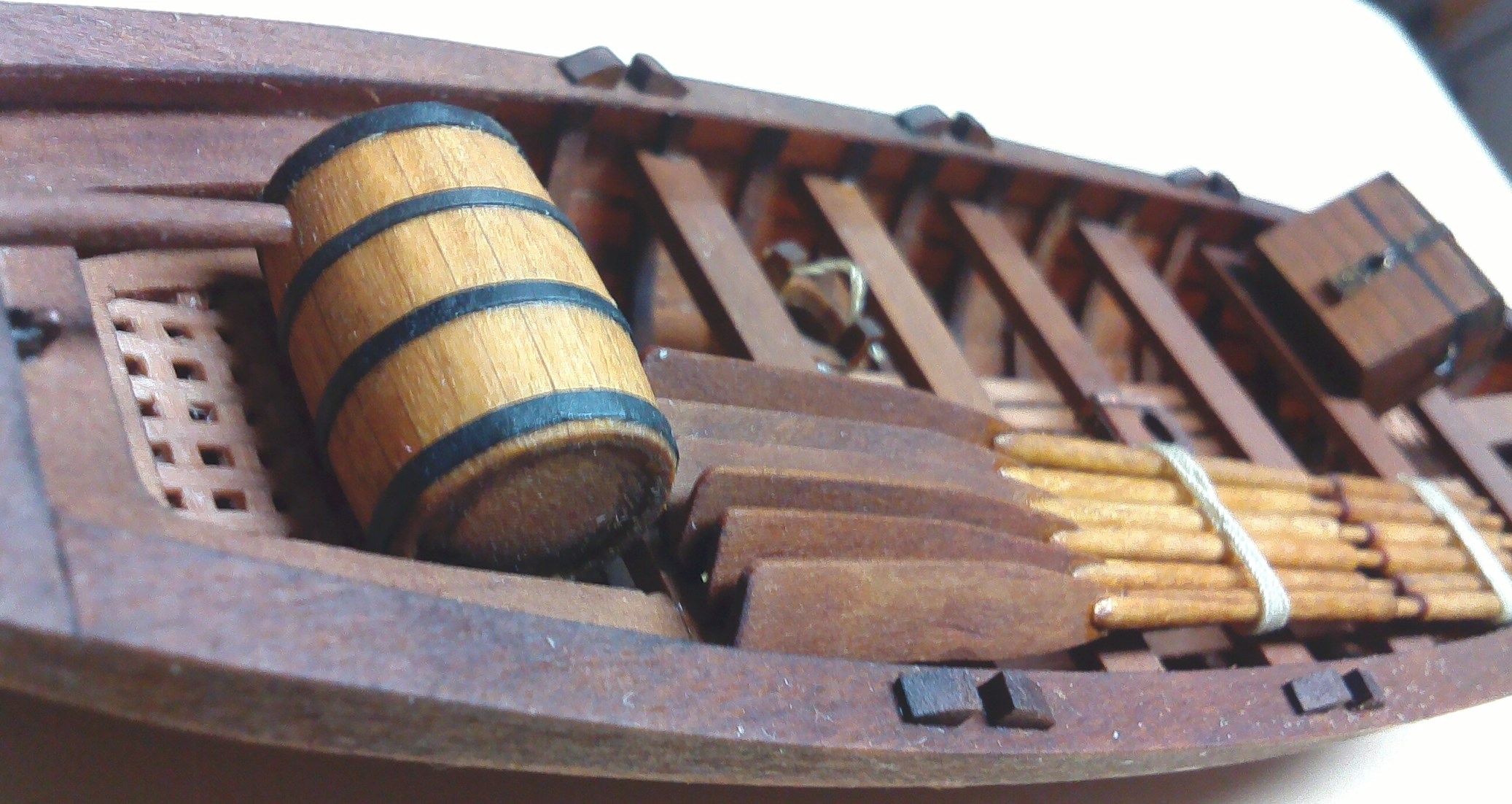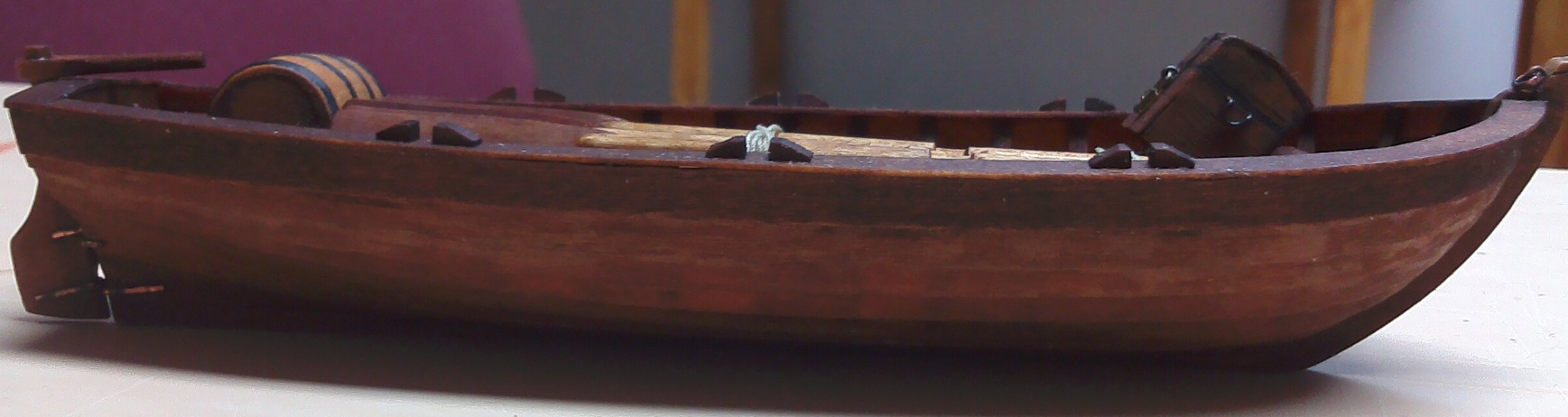 Tymczasem powstała łódź:Na wyposażeniu wiosła, beczka na rum, wiadro na wodę, i pobudzająca wyobraźnię laików wychowanych na "Piratach z Karaibów", skrzynia na kosztowności.