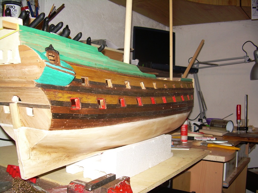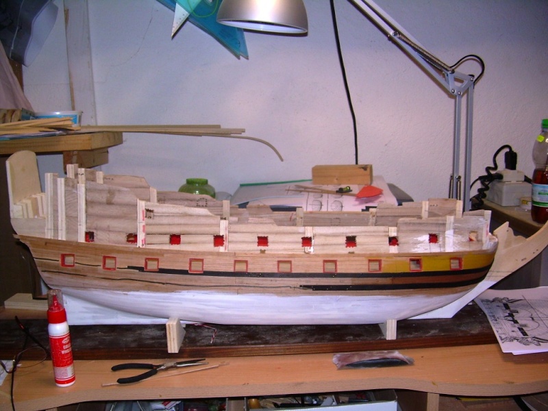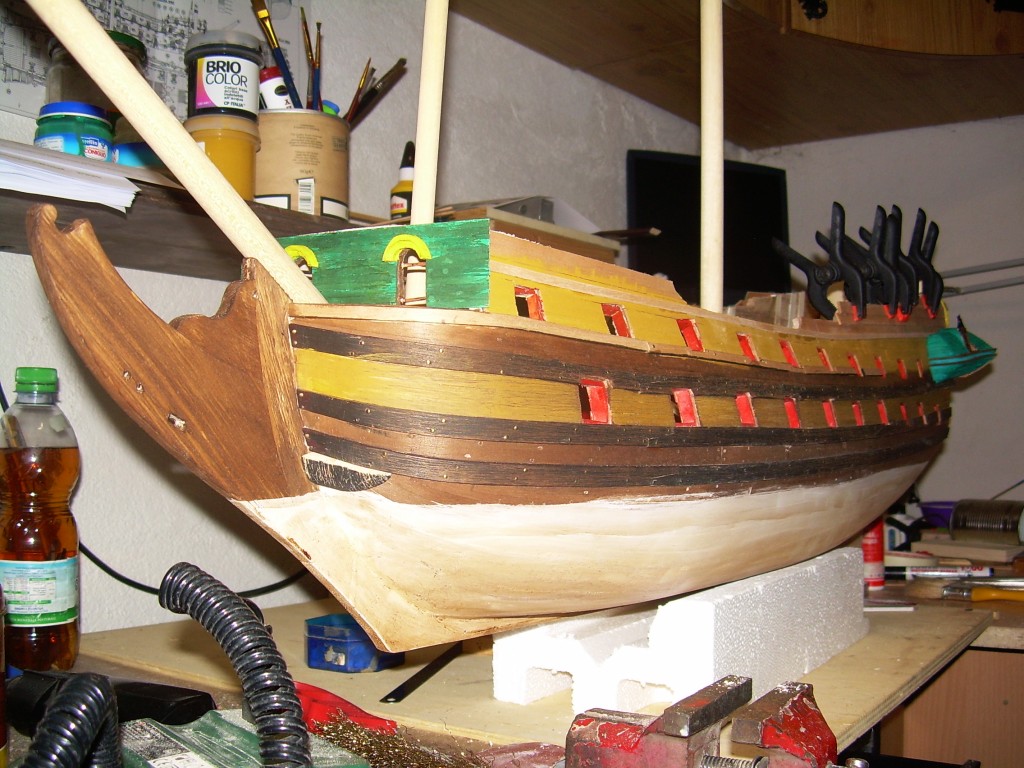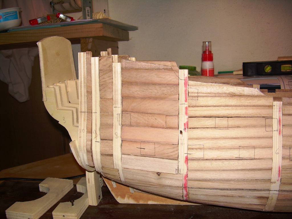 Kadłub masz ładnie wypełniony, naniesione pozycje furt działowych. Z jakiego drewna będziesz robił poszycie?