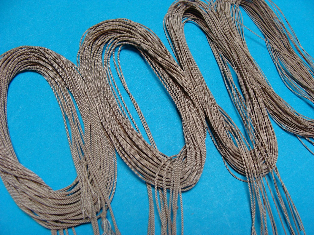 Jeszcze jeden szczegół to nici.Zastosowałem nici poliesterowe o odpowiednim kolorze 0774 grubość(talia) 0,3 i 0,12.Do kupienia chyba w każdej pasmanterii.Kolor dobrałem tak,że dla olinowania ruchomego nie trzeba z nimi nic robić oprócz opalenia.Do olinowania stałego oczywiście impregnat na bazie wosku,kalafonii,smoły i innych specyfików podanych przez Mirka.Linki wychodzą od pojedynczych trzech talia 120(fi0,3) zwiększanych stopniowo o 0,3 mm ,lub z tych grubszych talia 30 odpowiednio grubsze.