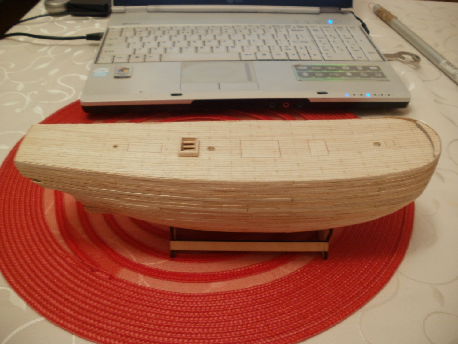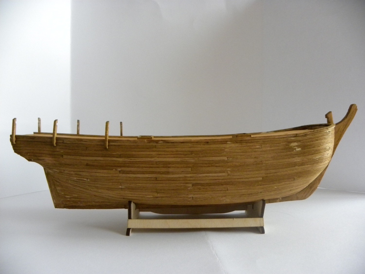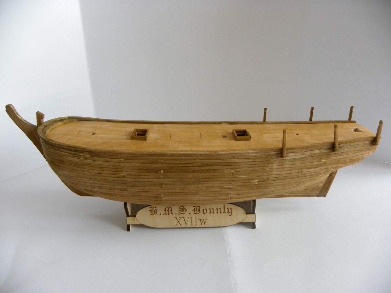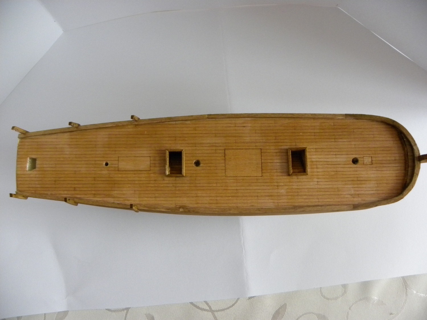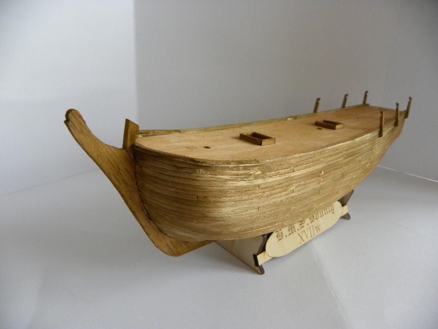 Po dokładnym usunięciu nierówności i uzyskaniu gładkości dokleić stępkę, stewy i wykończyć nadburcie co jest oczywiste. Następnie :