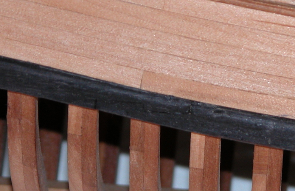W bardzo wielu modelach wstawki na burtach (np. odbojnice) wykonywane są z hebanu - nota bene na moich planach wyraźnie zaznaczono, że powinny być one ciemne. W pełni się zgadzam, że wygląda to bardzo ładnie. Ale trudno mi jakoś uwierzyć, że w realu odbojnice wykonywane były z hebanu właśnie. Ale niech tam. Hebanu nie mam, więc zabejcowałem listewki z olchy.
