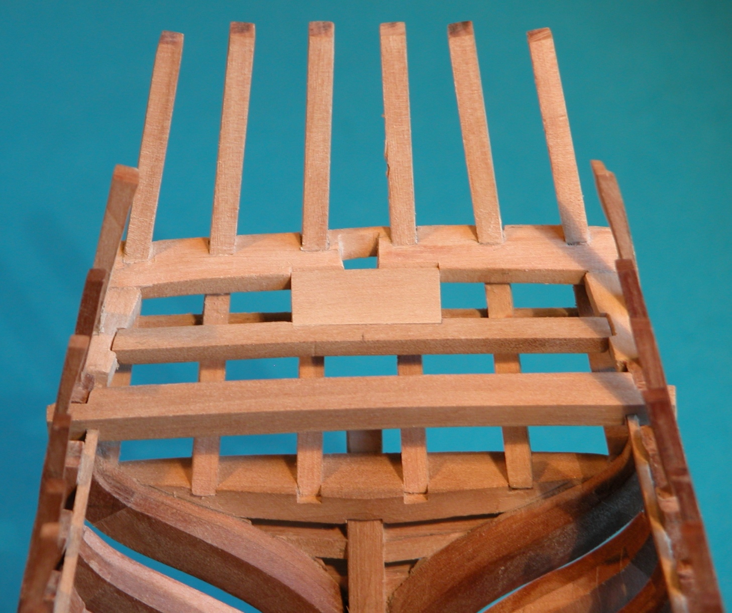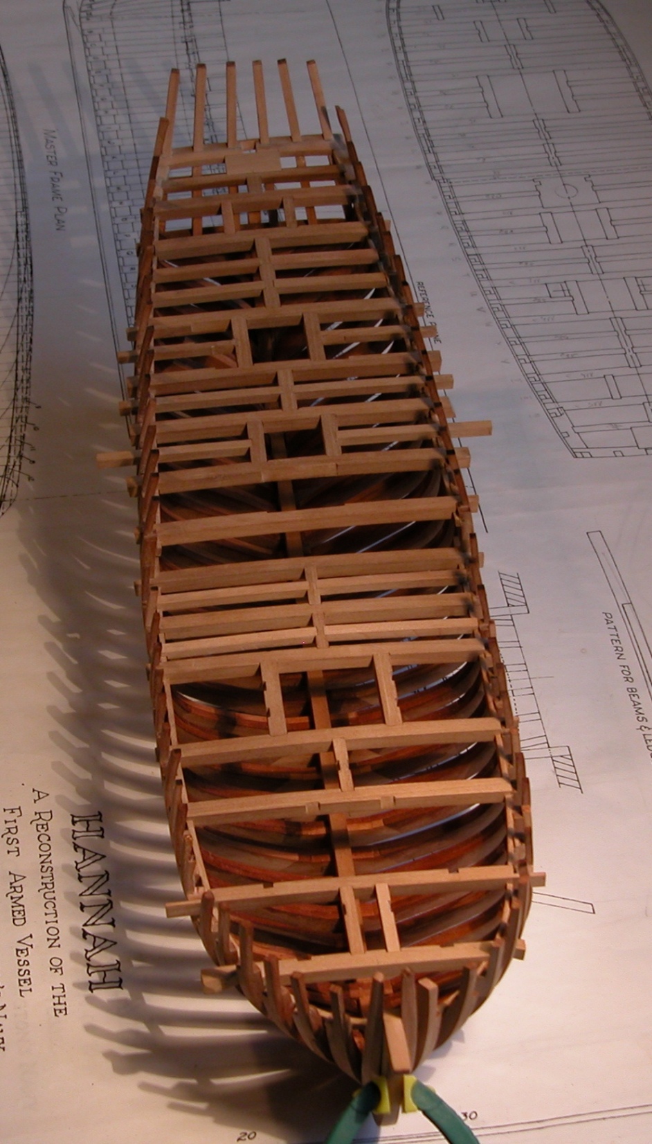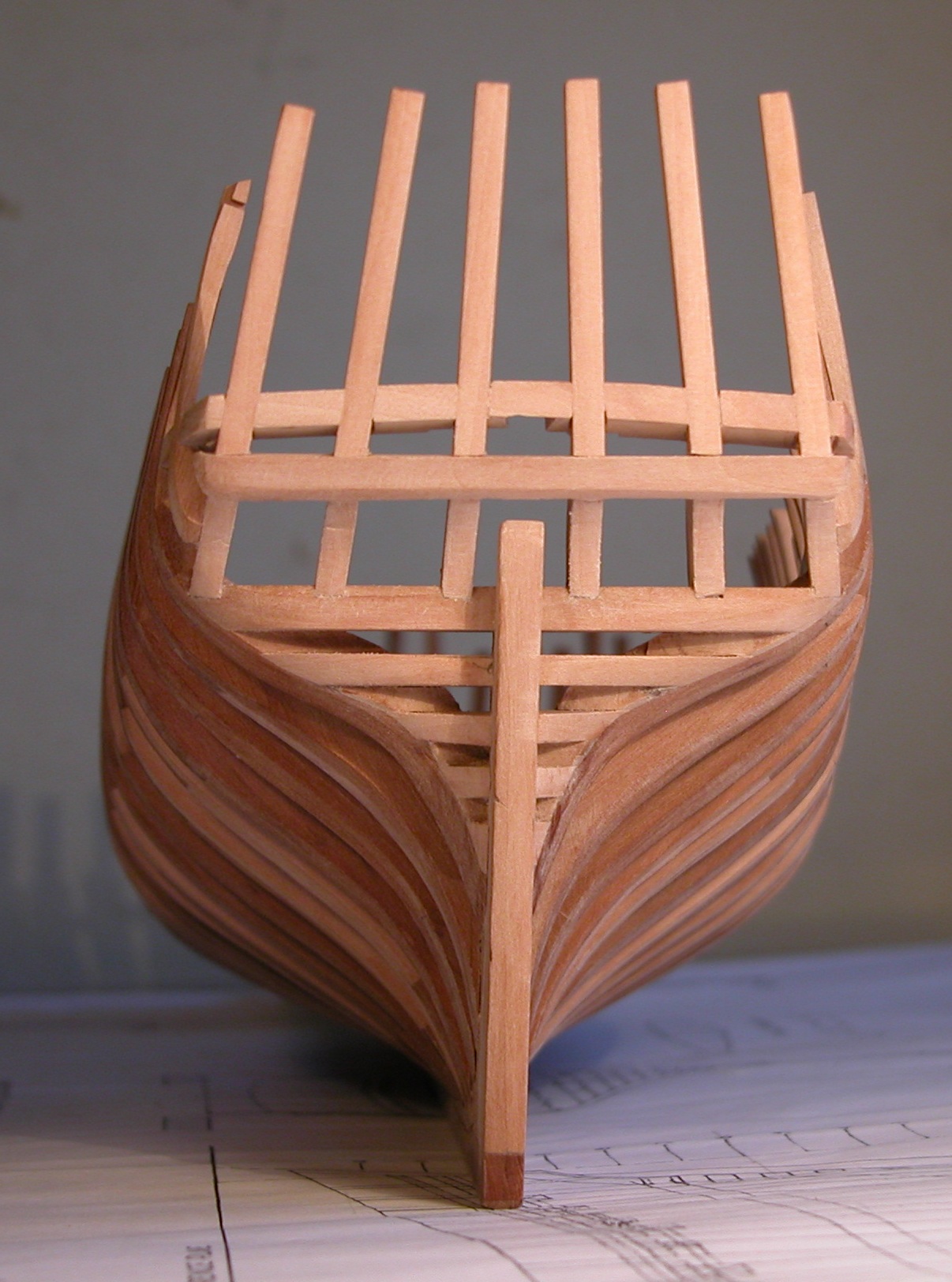 Zadowolony z siebie zacząłem docinać pierwsze pokładniki (wcześniej wygięte zgodnie z szablonem). I po włożeniu na miejsce pierwszego (póki co na sucho) samozadowolenie prysło jak bańka mydlana. Okazało się, że nie tylko głupi jestem jak but, ale i planów czytać nie potrafię – poprzeczkę usztywniającą żebra pawęży (która jednocześnie pełni rolę najbliższego rufy pokładnika) zamocowałem bowiem na wysokości (a właściwie na przedłużeniu) listwy, na której będą opierać się pokładniki. Czyli o ok. 2 mm za nisko.