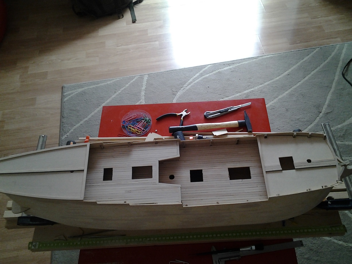 Uzyj zestawowego 'forniru' na podpoklad, na ktorym naklejaj swe planki wzdluz wyrysowanej uprzednio na nim linii centralnej biegnacej w dlugiej osi pokladu, idac od srodka ku burtom, zwracajac uwage na w/w typ 3:1 koncow stykow planek. (Oczywista, w tej sytuacji Twoj poklad bedzie o ok. 1 mm. wyzszy od pokladu zestawowego - o ta grubosc naklejanych planek, ale zwazywszy skale modelu, nie powinno to byc problemem. Jesli jednak tak, to zawczasu obniz wysokosc Twego pokladu na wregach (grodziach), podpilowujac tam wsporniki pokladowe o ten wymiar).