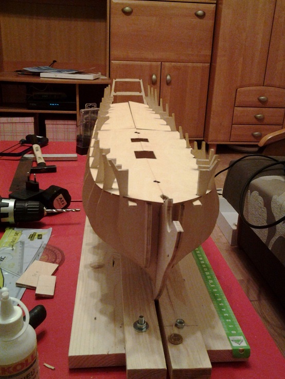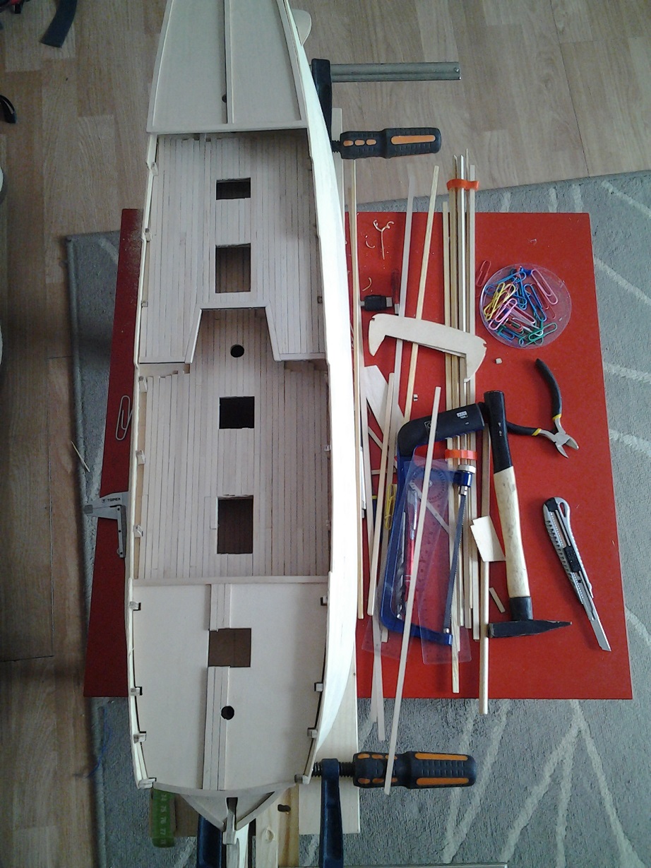 Uzyj zestawowego 'forniru' na podpoklad, na ktorym naklejaj swe planki wzdluz wyrysowanej uprzednio na nim linii centralnej biegnacej w dlugiej osi pokladu, idac od srodka ku burtom, zwracajac uwage na w/w typ 3:1 koncow stykow planek. (Oczywista, w tej sytuacji Twoj poklad bedzie o ok. 1 mm. wyzszy od pokladu zestawowego - o ta grubosc naklejanych planek, ale zwazywszy skale modelu, nie powinno to byc problemem. Jesli jednak tak, to zawczasu obniz wysokosc Twego pokladu na wregach (grodziach), podpilowujac tam wsporniki pokladowe o ten wymiar).