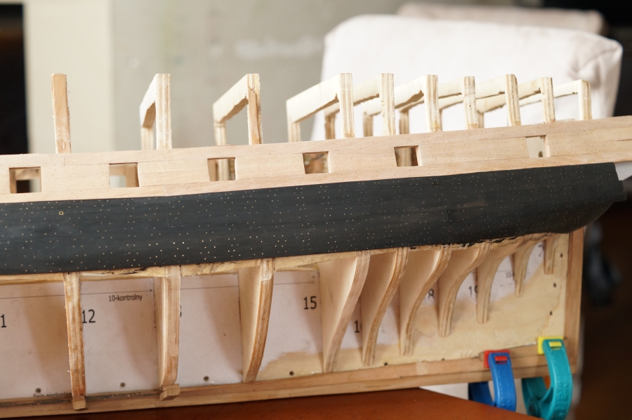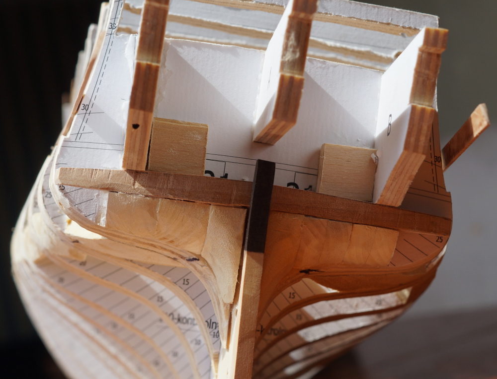 Powolutku... Musiałem porobić trochę korekt na wręgach, a kilka niestety wyciąć powyżej głównego pokładu. Powklejałem klocki na linii wody, gdzie będzie zmiana gatunku drewna, oraz na rufie. No i pierwsze planki wyznaczające z grubsza przebieg furt działowych.
