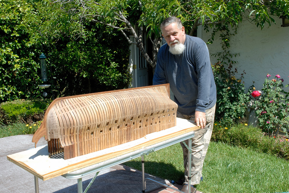 Robiony metoda H. Hahna, tj. szkielet odwrocony do gory nogami, w desce montazowej, po skonczeniu poszycia gorne naddatki wreg beda obciete i kadlub w ten sposob 'uwolniony'. Ale to jeszcze daleka przyszlosc...)