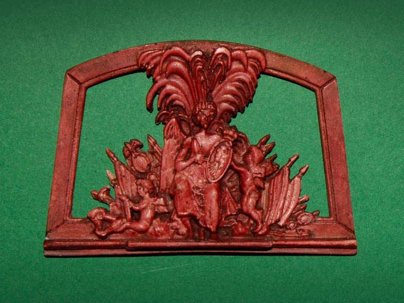 Metalowy odlew, mosiądzowany (efekt złocenia), idzie po łuku (nie płaski), dość głęboko płaskorzeźbiony.