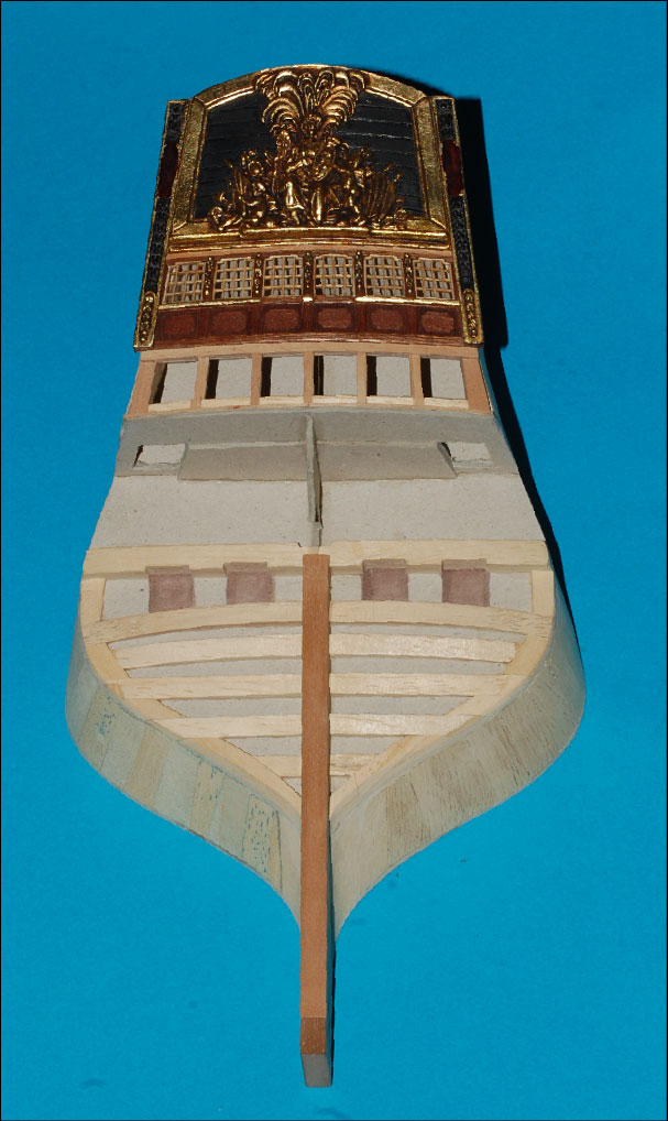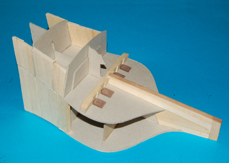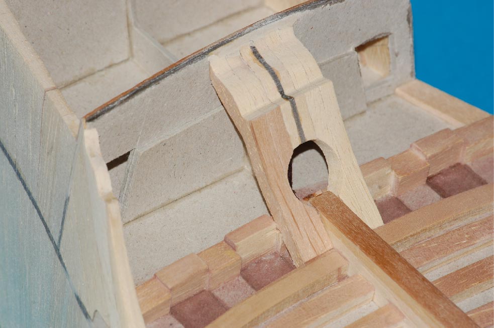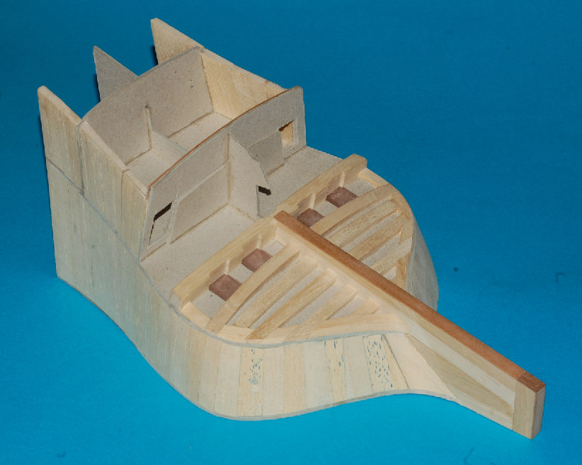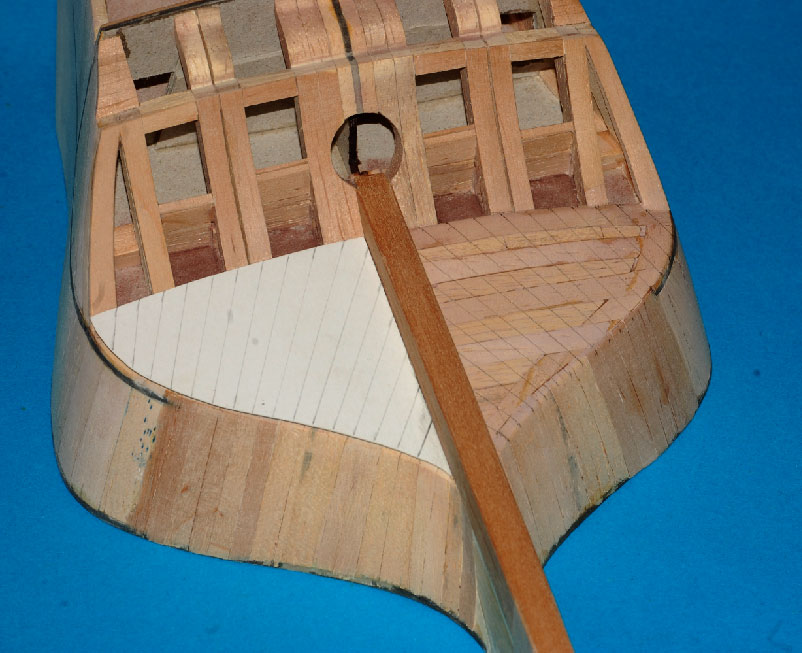 Nakleiłem listewki imitujące stewę rufową i kil. Przygotowałem belki nad ambrazurami (z planu) i wzmocnienie konstrukcyjne