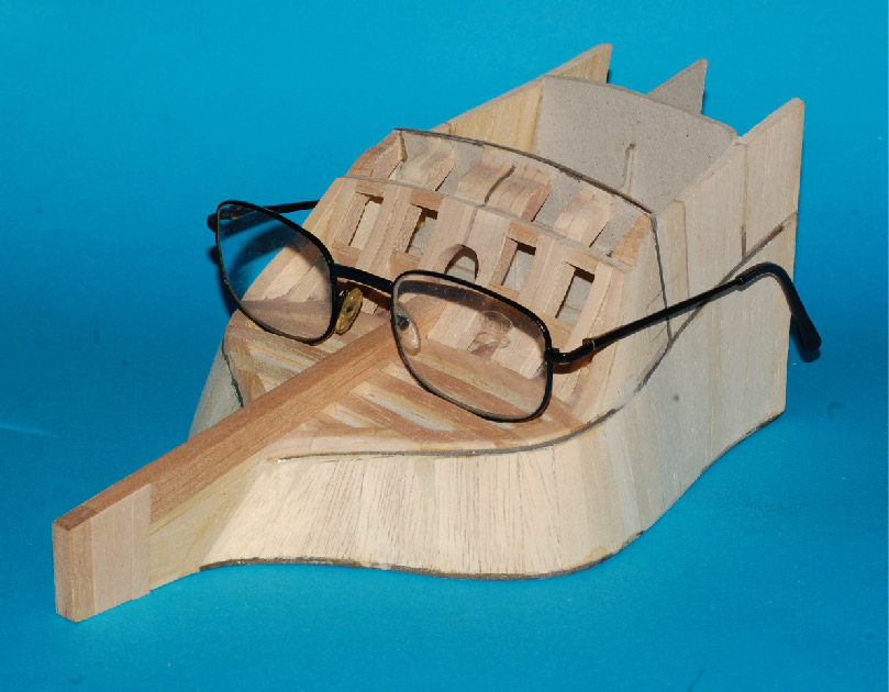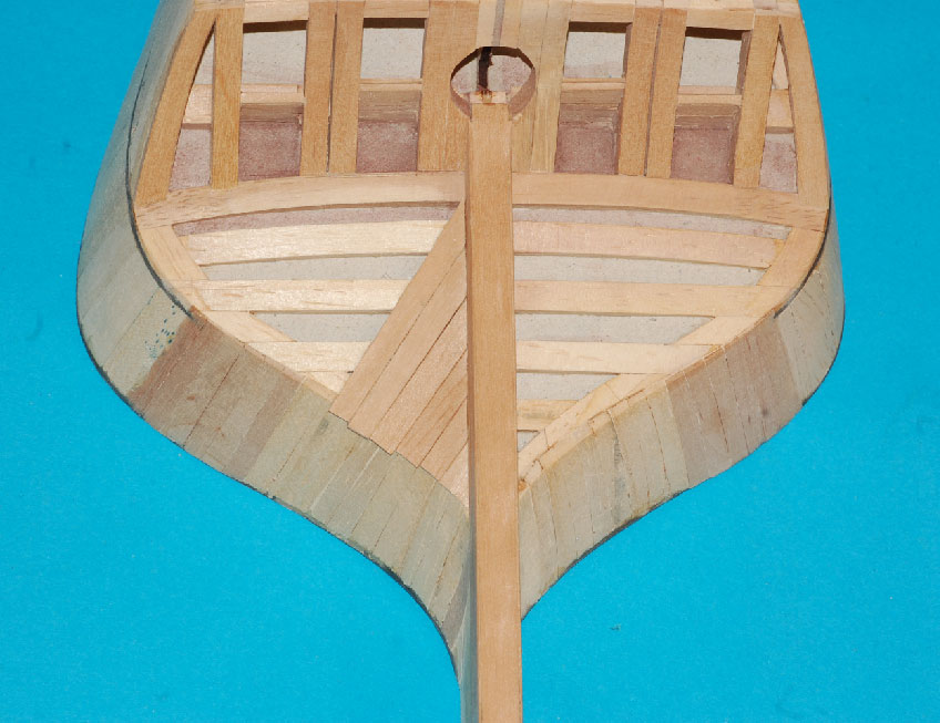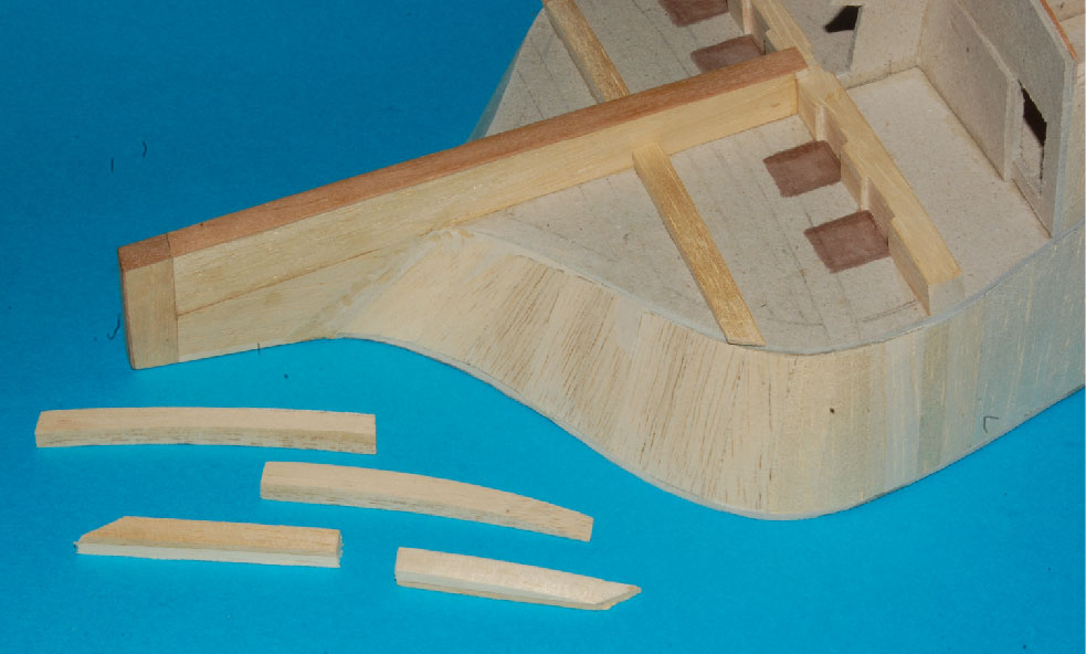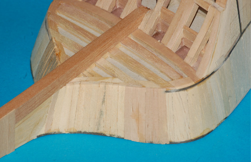 a pod deskowanie pawęży lite klepki miękkiego drewna (balsa, wawa, lipa), które doszlifujemy do odpowiedniego kształtu.