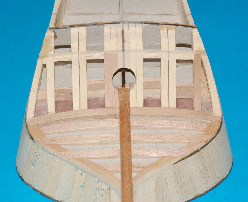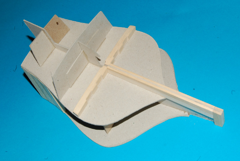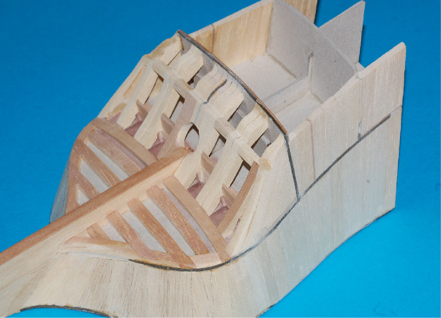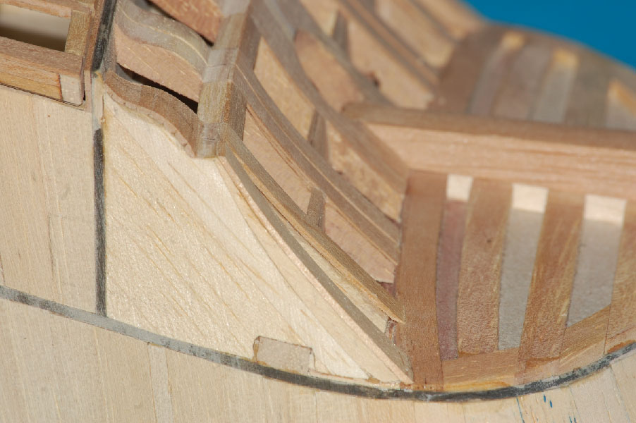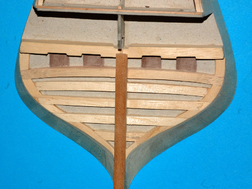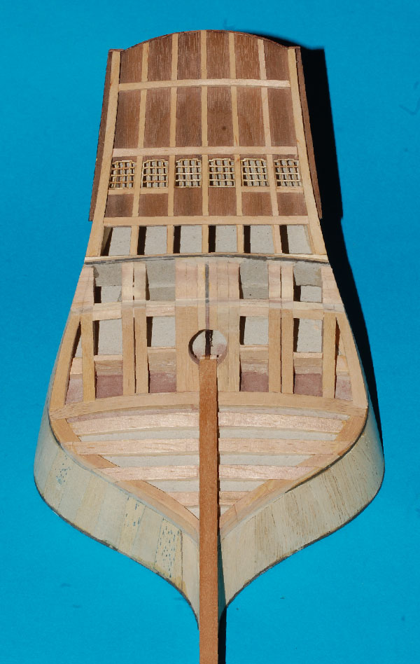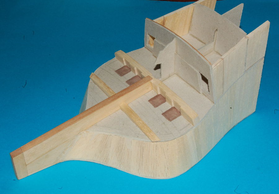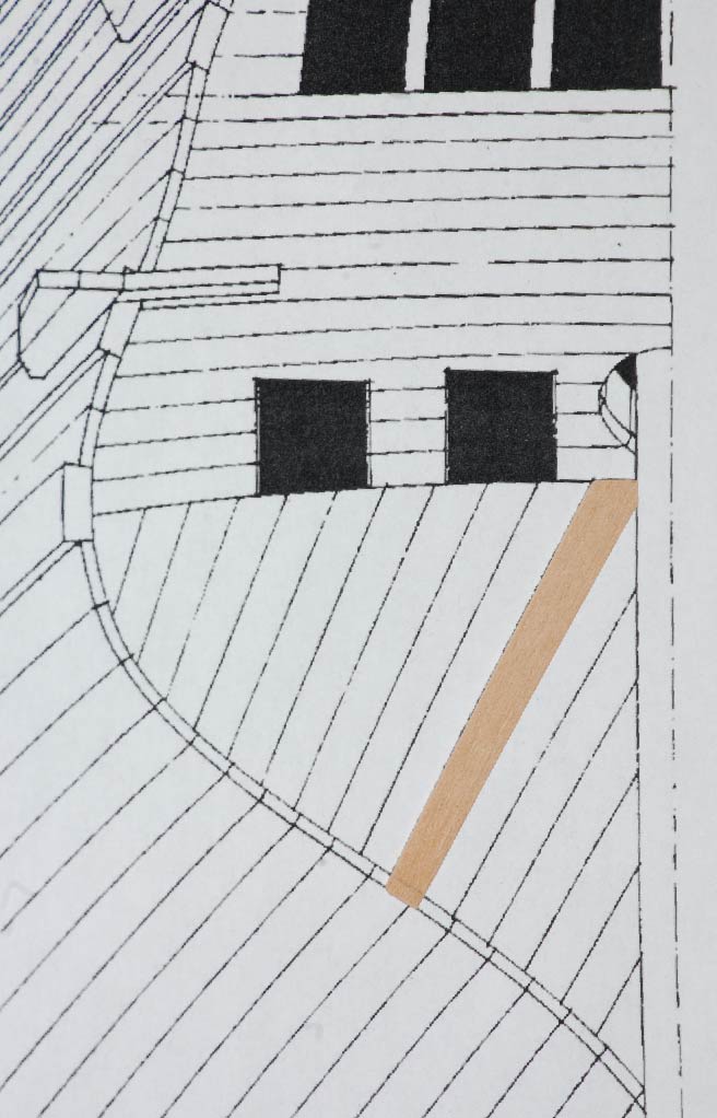 Nakleiłem listewki imitujące stewę rufową i kil. Przygotowałem belki nad ambrazurami (z planu) i wzmocnienie konstrukcyjne