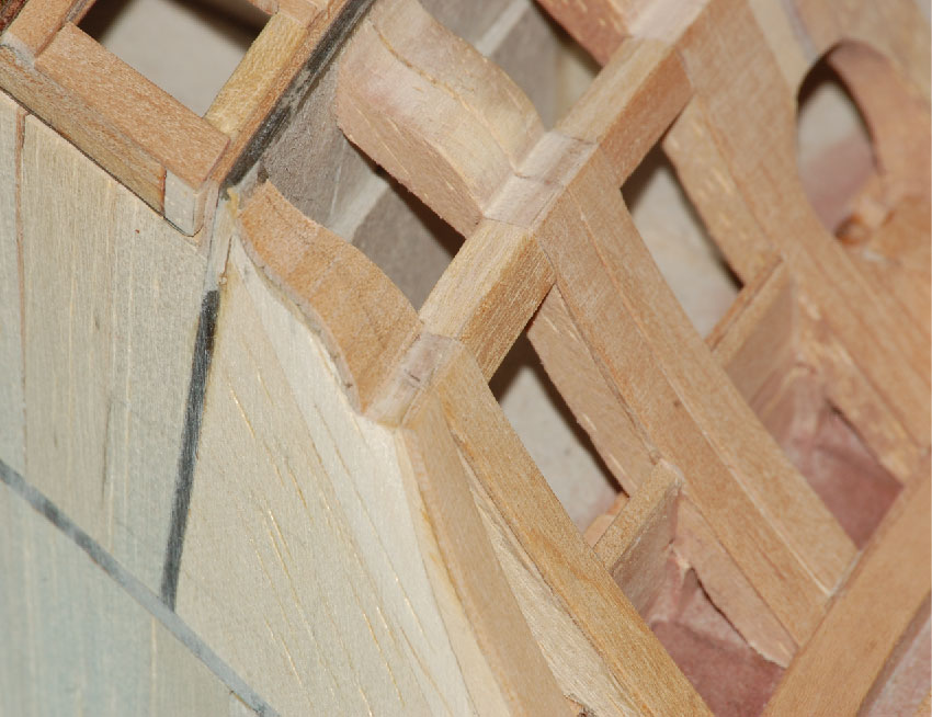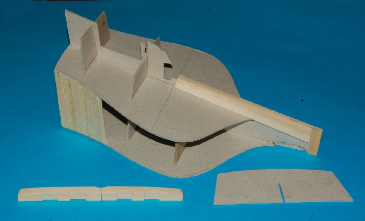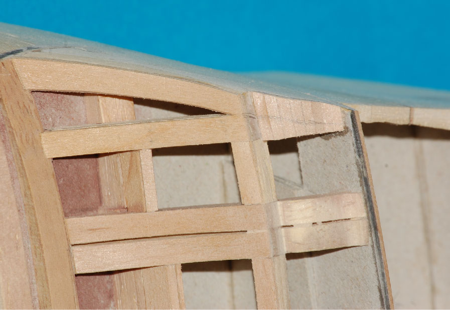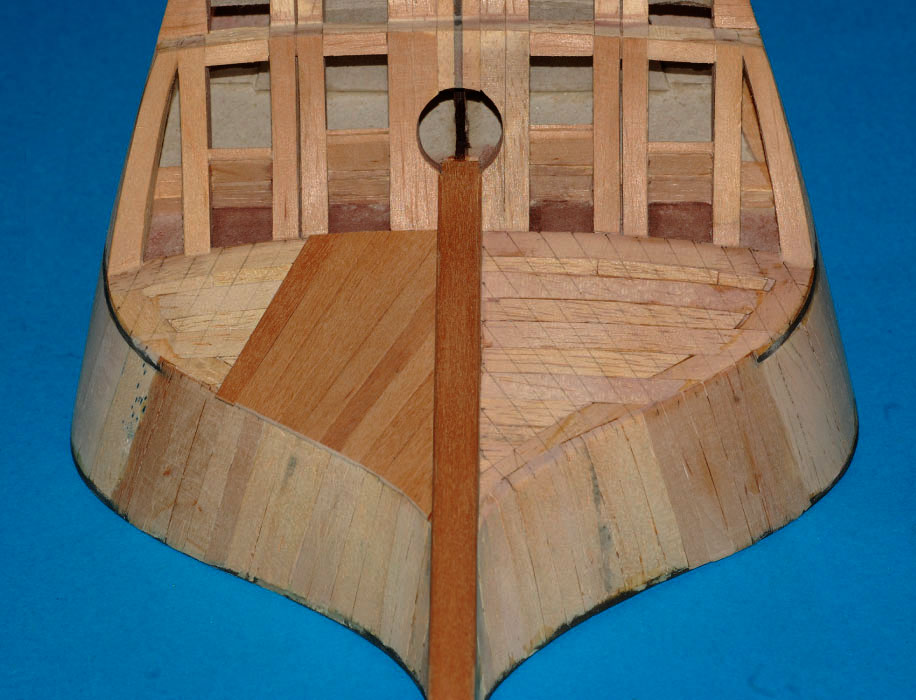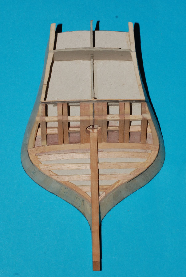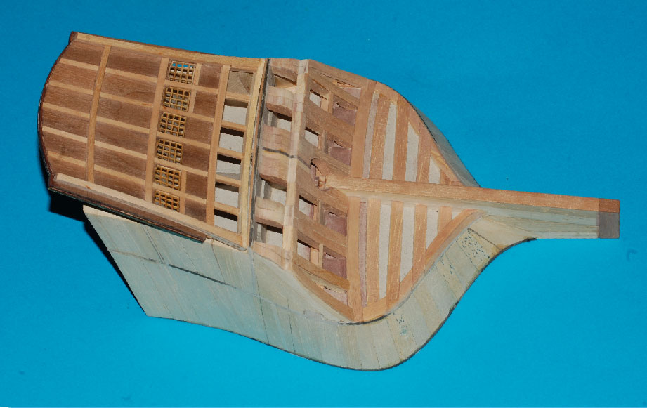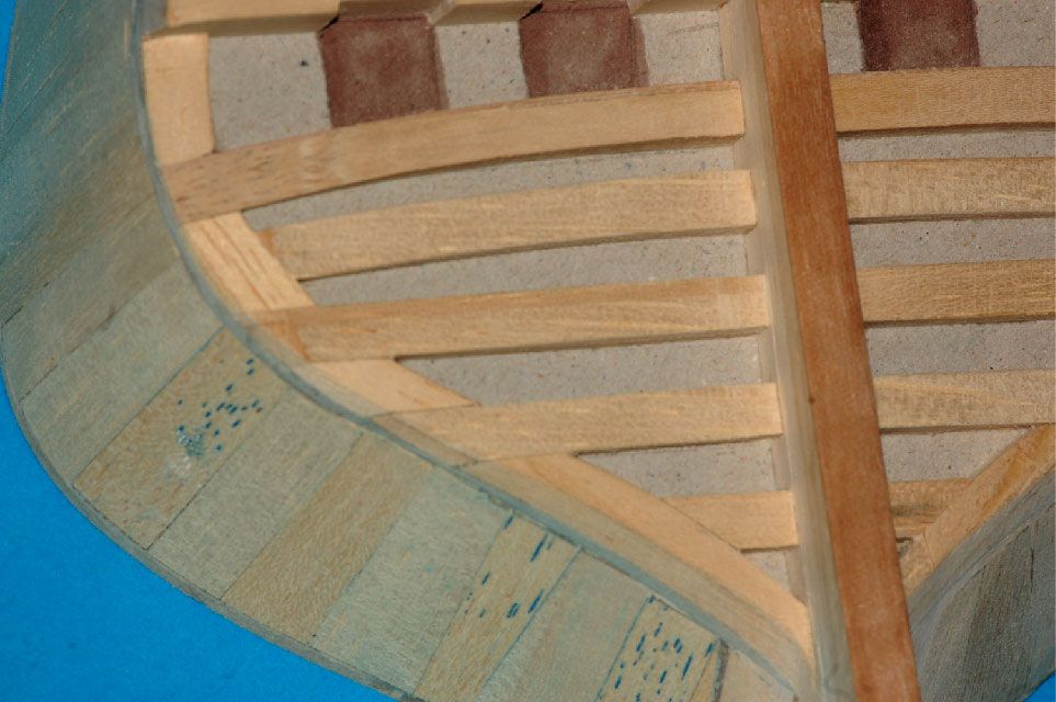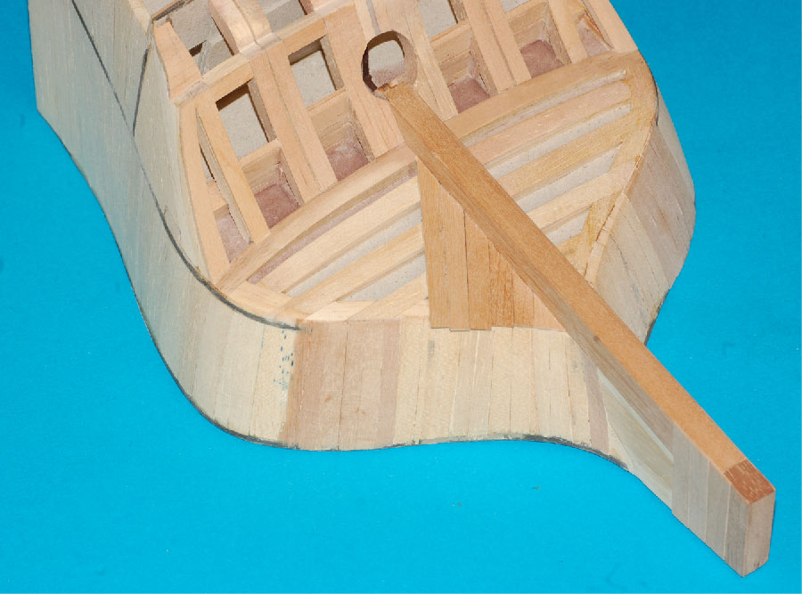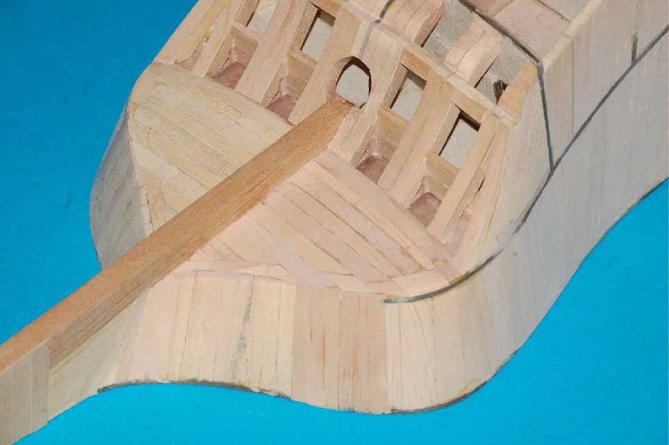 a pod deskowanie pawęży lite klepki miękkiego drewna (balsa, wawa, lipa), które doszlifujemy do odpowiedniego kształtu.