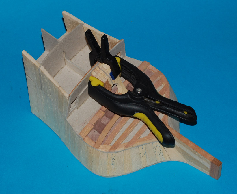 Poszycie robię z forniru - łatwiej układa się na obłości rufy - jednak puste przestrzenie między belkami sprawiają trudność z dociskaniem w trakcie klejenia. I tu na pawęży przydałoby się mieć lite drewno, jak pisałem o tym wcześniej.