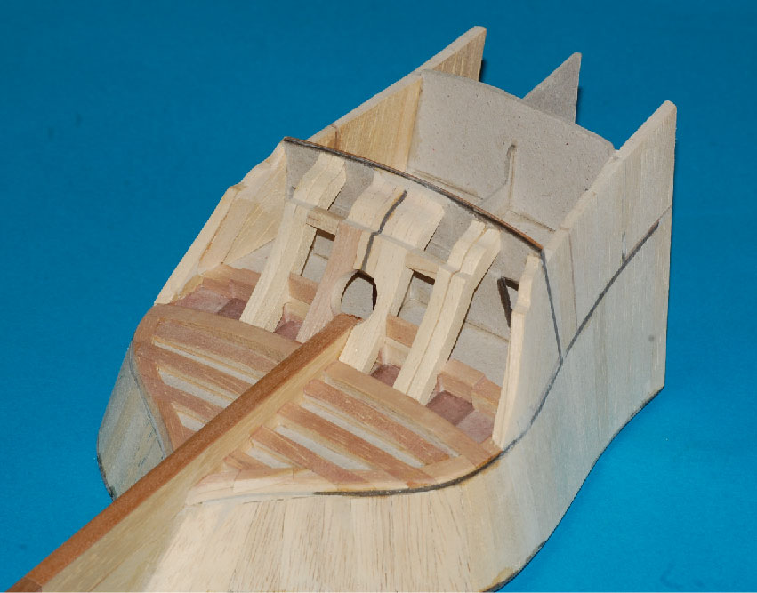 Kolejnym elementem będzie profilowany nawis pawęży. Upraszczając (na wzór kolekcji zeszytowych) mógłbym wkleić cztery profilowane trójkąty, ale więcej frajdy będzie jeśli zrobię to z belek (wg planów p. Boudriota). Zaczynam od środkowych z otworem na ster.