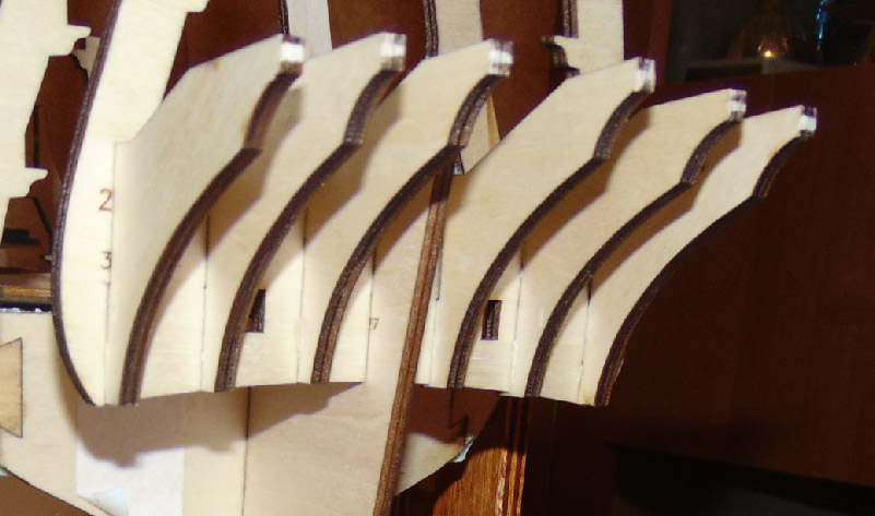 Skończyłem wklejać listwy między wręgami i zacząłem wklejać "belki" pod poszycie pawęży