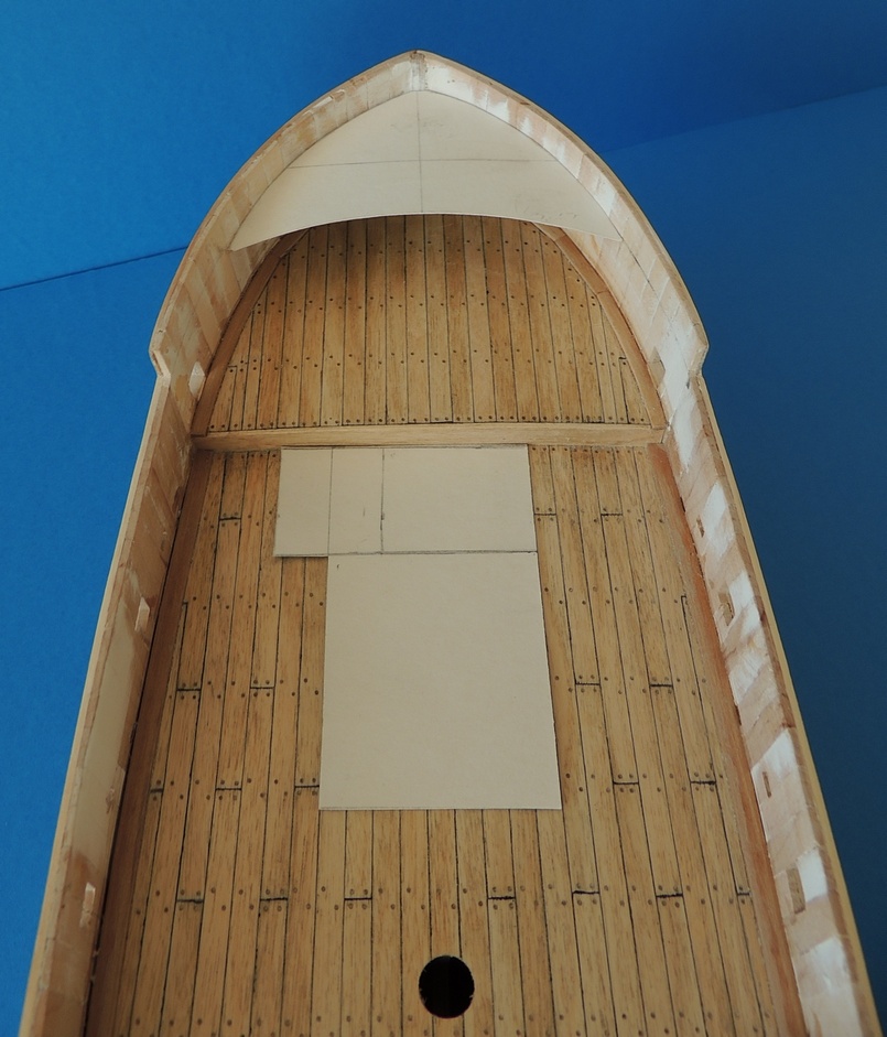 Witajcie. Tak to wygląda na dzień dzisiejszy. Pokłady gotowe. Na zdjęciach widoczny szablon małego pokładziku dziobowego i szablon gretingów.