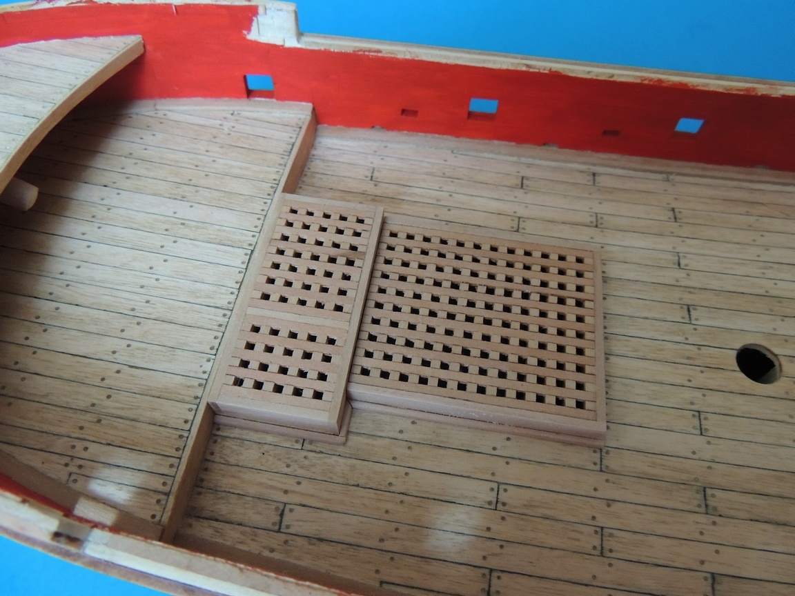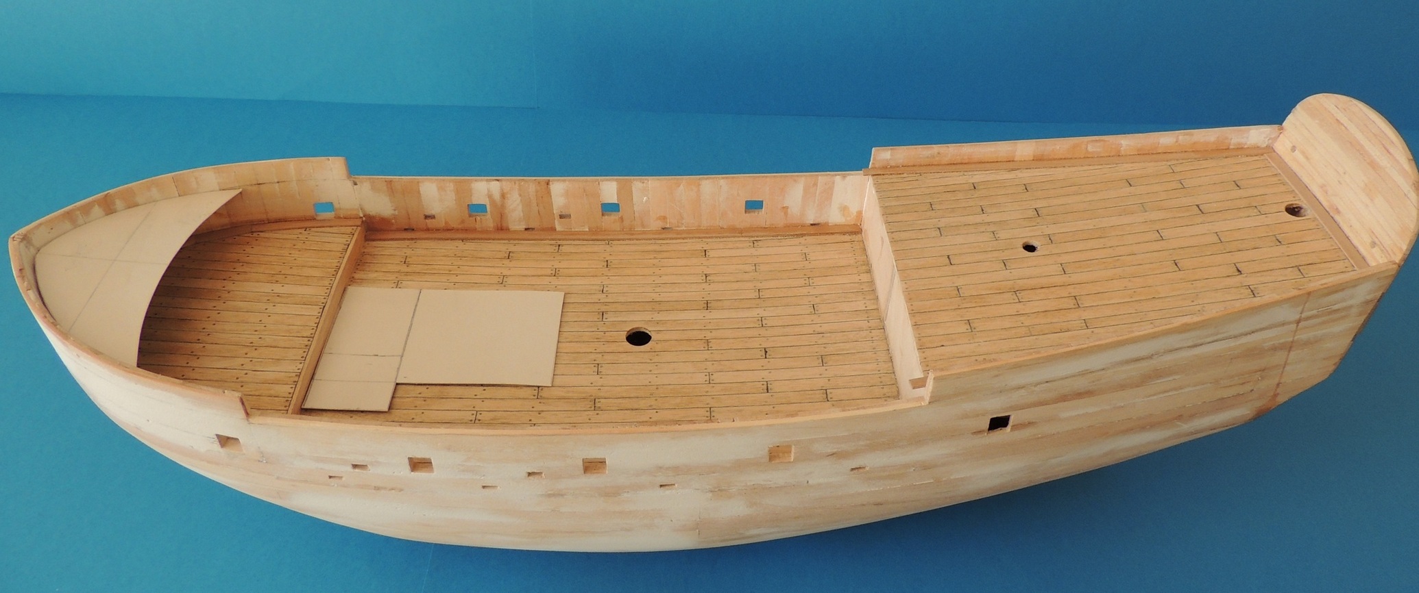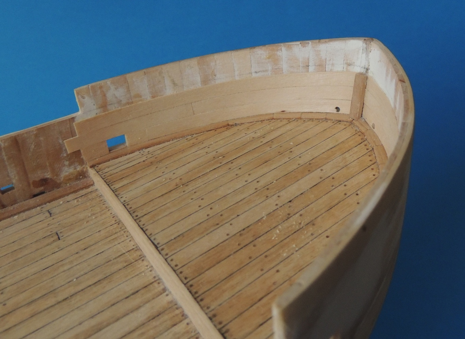 Od dziobu zacząłem wyklejać, fornirem brzozowym, nadburcia wewnętrzne. Nadburcia będą malowane na czerwono :D.Powstał też pokładzik dziobowy.